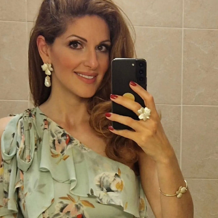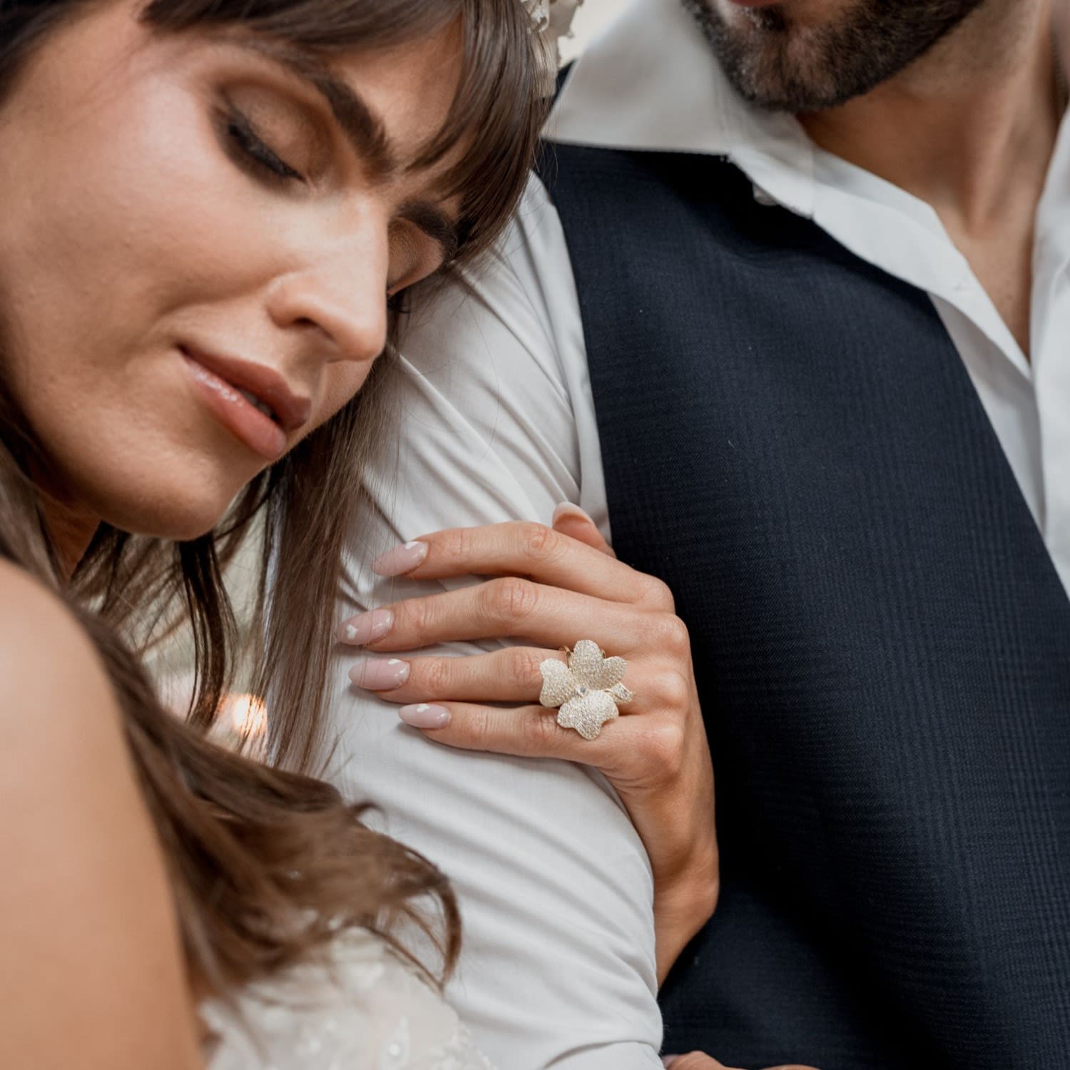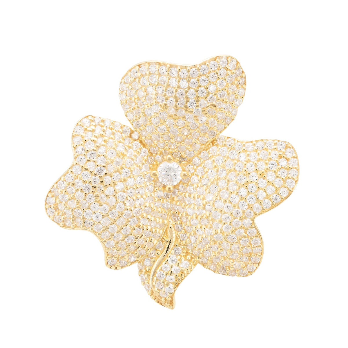 The Flower Cocktail Ring Gold by Latelita is an elegant and sparkling cocktail ring. This statement piece features a large flower prettily sitting atop a double metallic adjustable band. The ring is adorned with sparkling cubic zirconia, adding a sophisticated style. It is handcrafted in sterling silver and dipped in 18-karat gold.