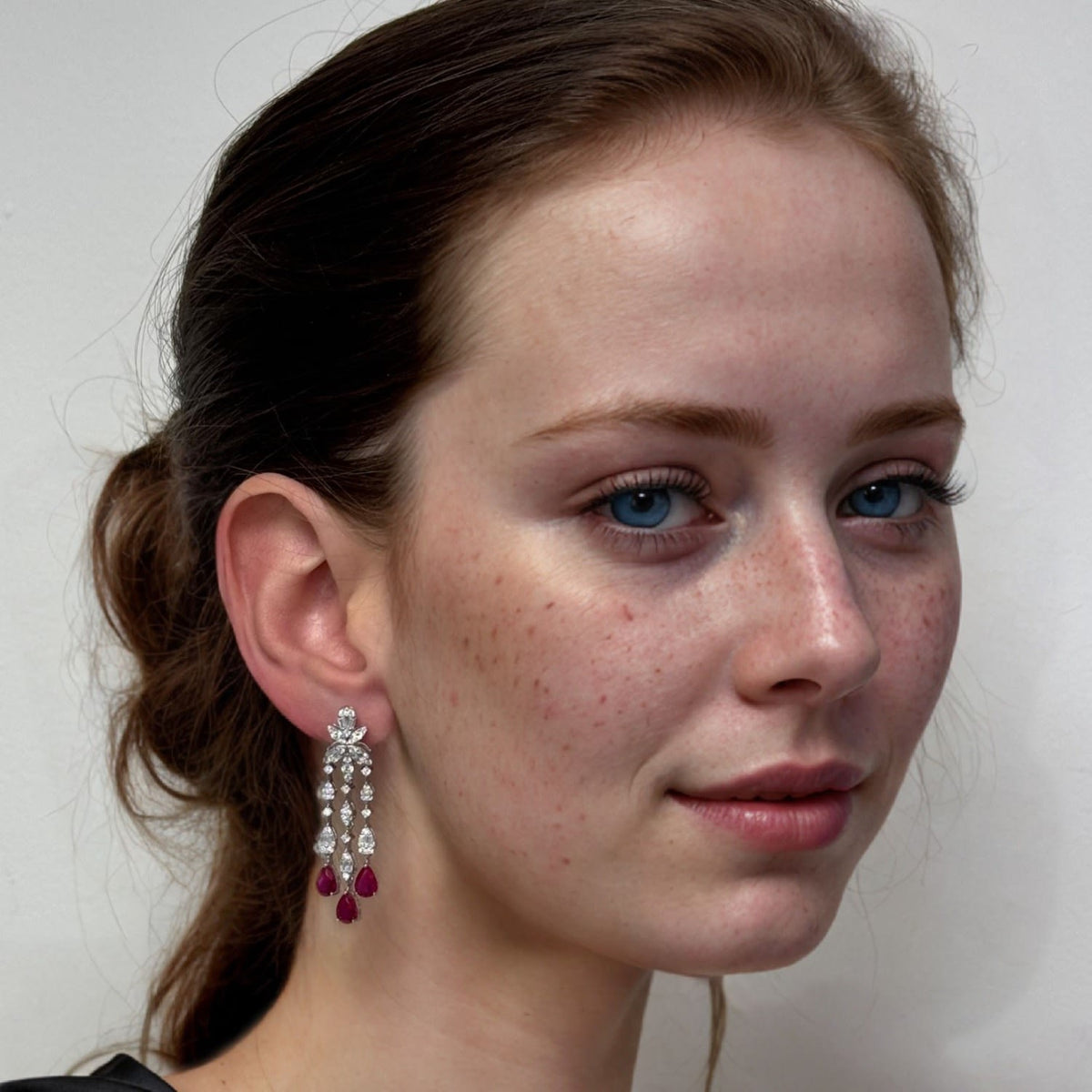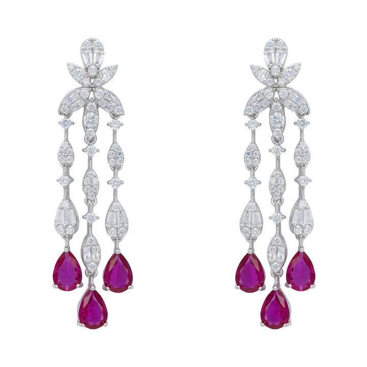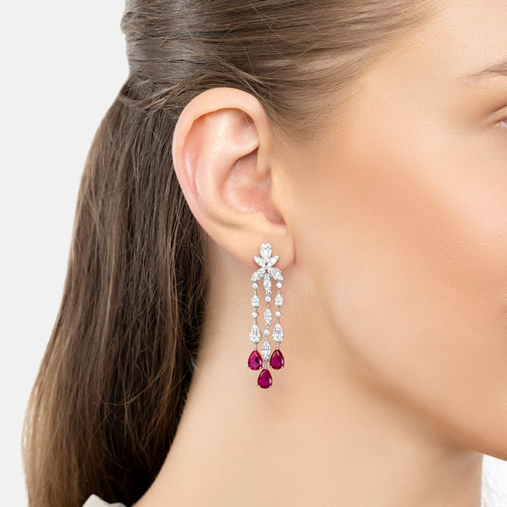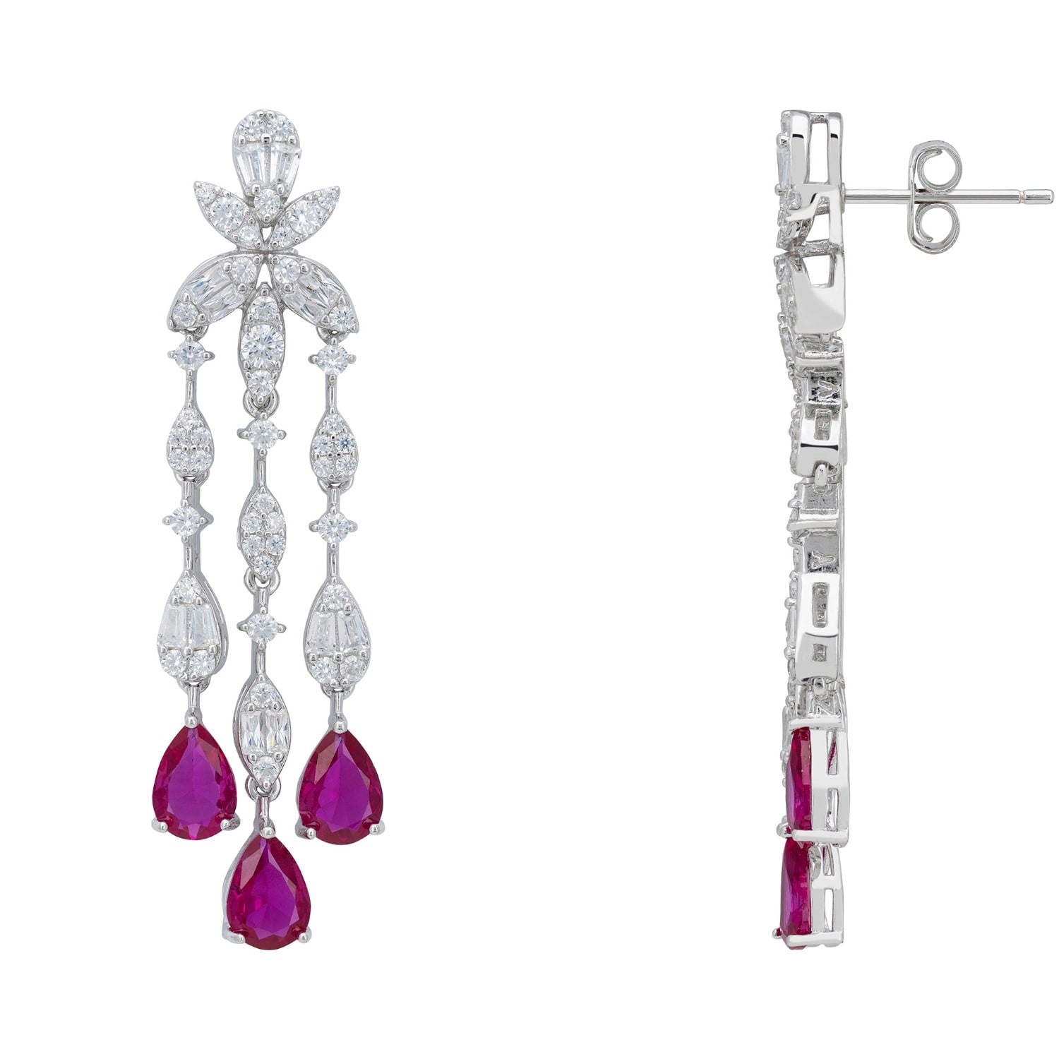 These drop earrings are handcrafted from 925 sterling silver. They are set with a lab-grown ruby and simulated diamonds.