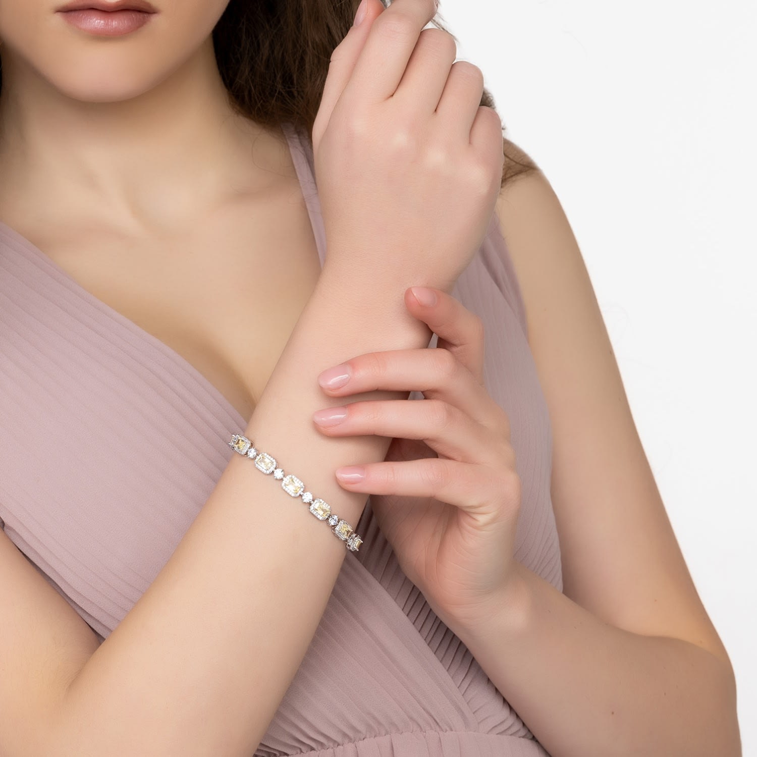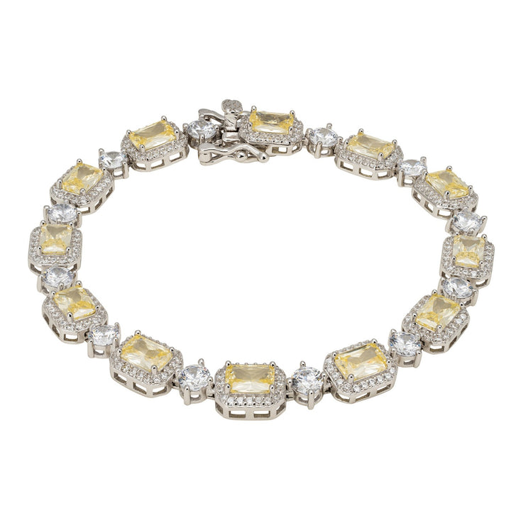 This Elena Gemstone Bracelet - Lemon Topaz Silver by Latelita is the ultimate wrist candy, fusing style with significance. It features 12 radiant rectangular lab-created lemon topaz gemstones, each encircled by a halo of sparkling cubic zirconia. The uplifting and energizing properties of the lemon topaz make this a piece that not only looks good but also feels good to wear. It's a statement of vibrant energy and refined sparkle.
