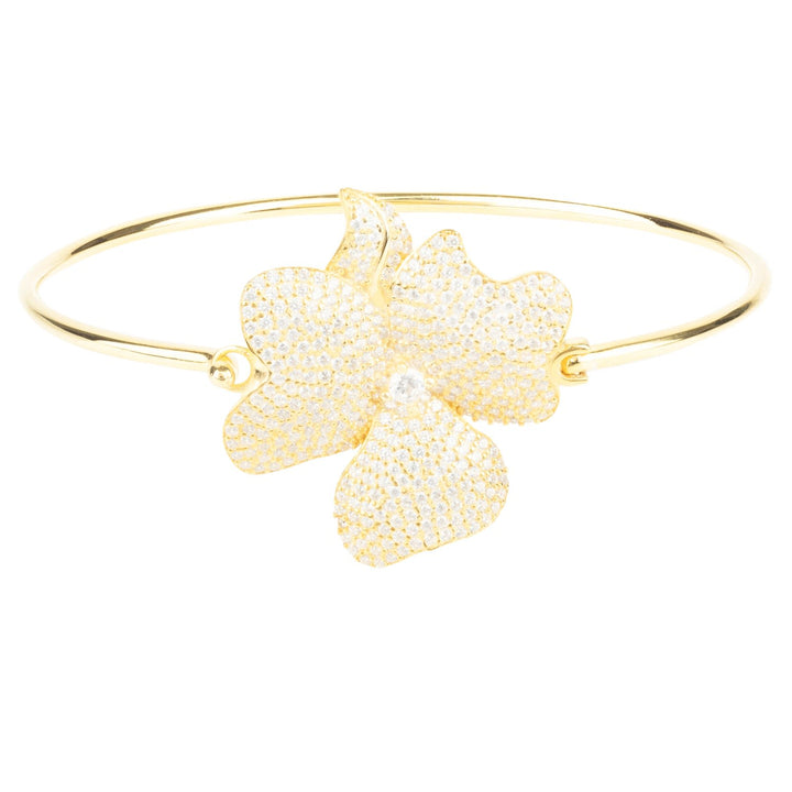 This cuff bracelet is made from 925 sterling silver dipped in 18ct gold and features a handset micro pave AAA grade white cubic zirconia encrusted flower.