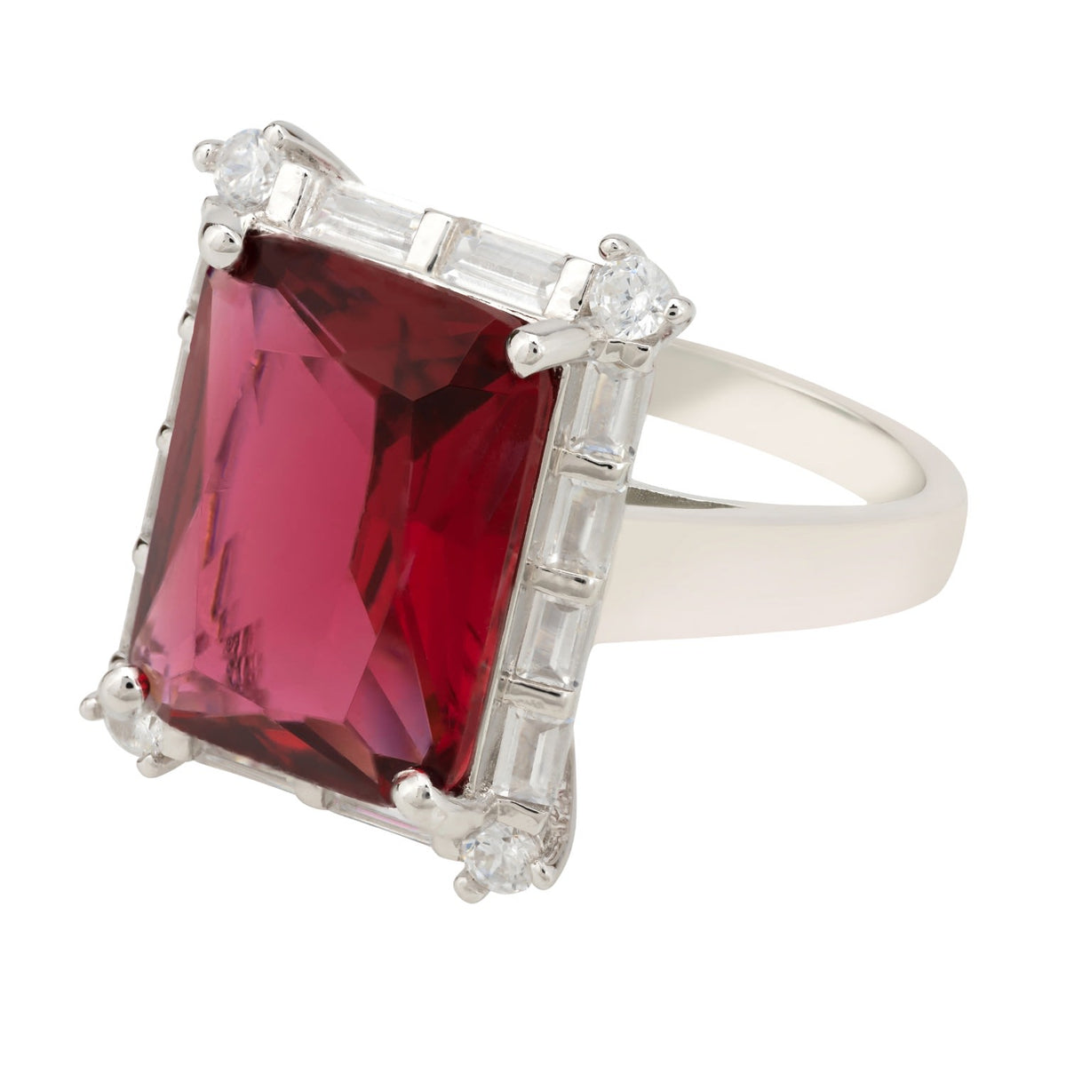 The Tudor Silver Ring Ruby by Latelita is a bold and colorful cocktail ring perfect for those who love statement jewelry. It features a large rectangular shaped cultured Ruby surrounded by baguette-cut white zircons. The design is sure to make a statement and is an ideal gift for gemstone lovers, especially those with a July birthday.