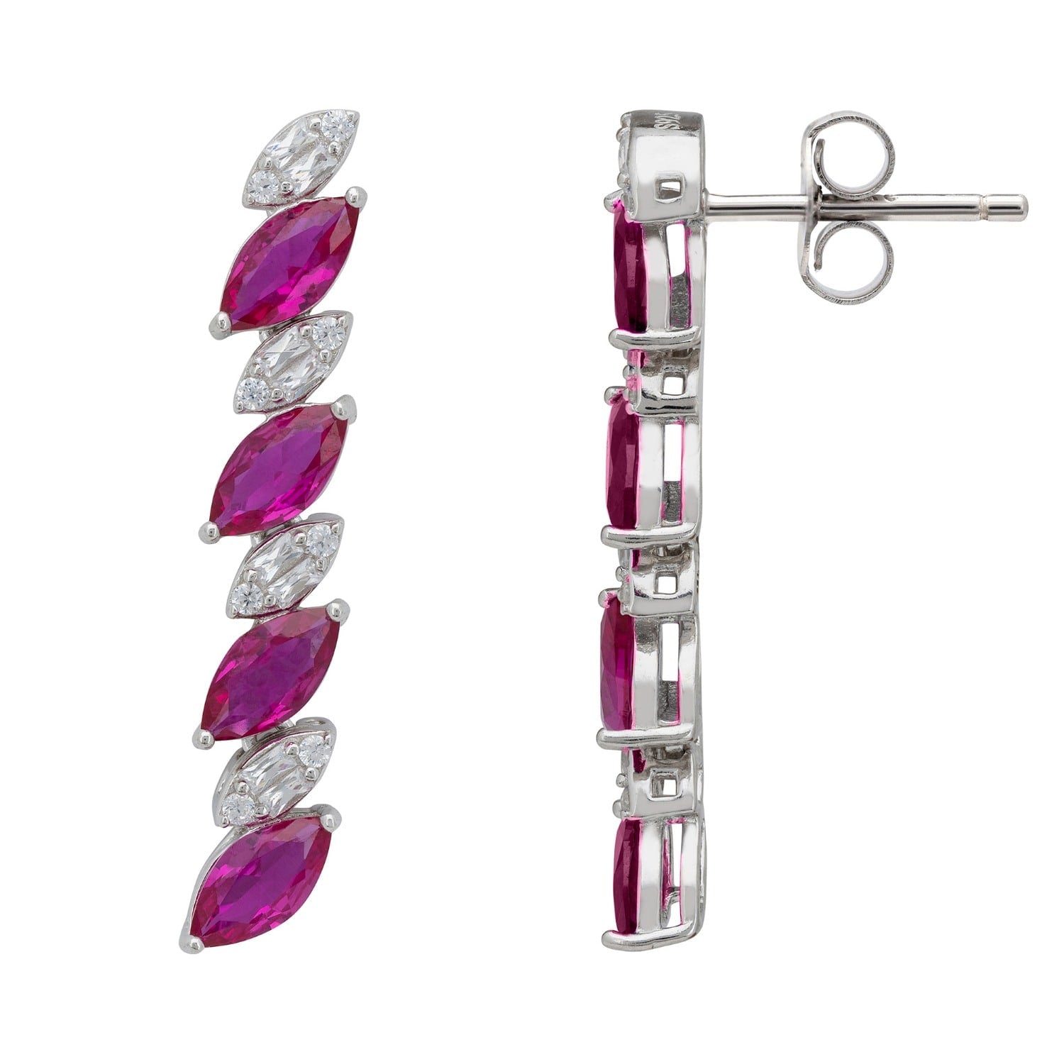 These earrings are handmade from 925 Sterling Silver dipped in Rhodium and feature lab-grown ruby and simulated diamonds.
