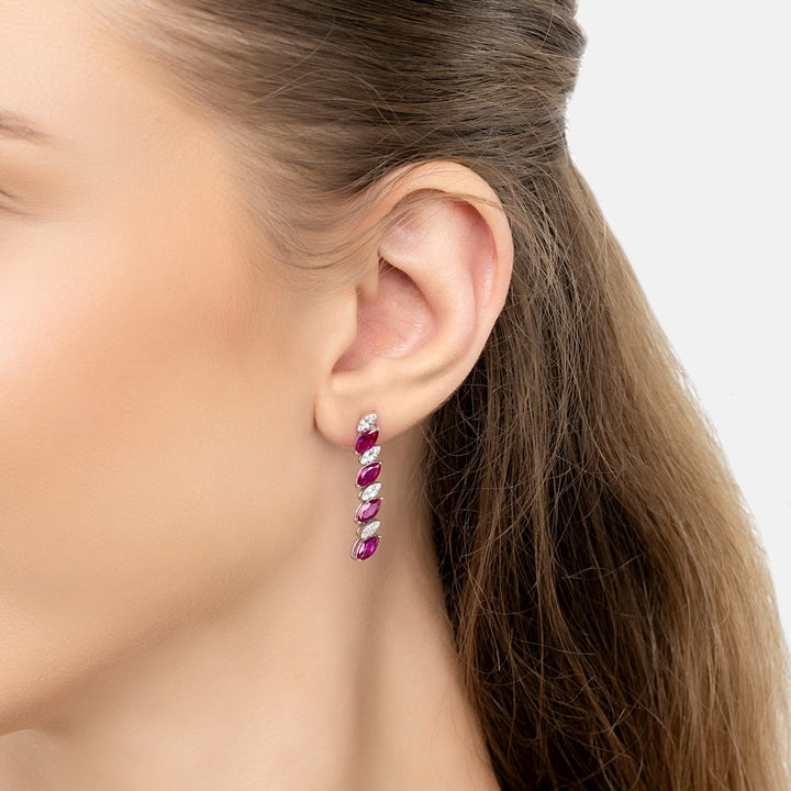 The Viscountess Tennis Drop Earrings Ruby Silver by Latelita are designed to frame your face with elegance and fire. They feature a graceful line of alternating lab-grown rubies and simulated diamonds in the signature Marquise shape. Handcrafted in 925 Sterling Silver and dipped in Rhodium, these earrings are a finishing touch of confidence.