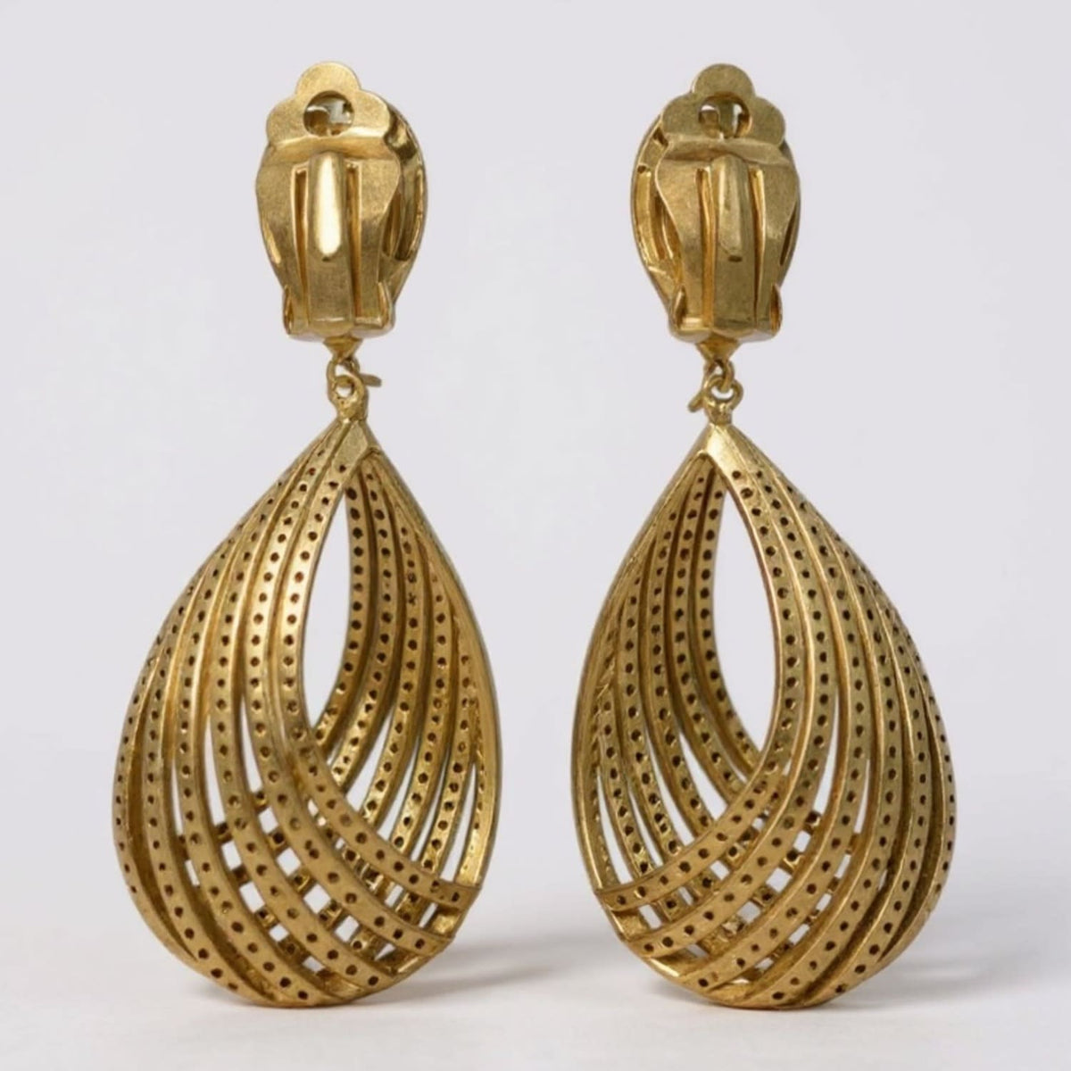 These Vortex Teardrop Clip On Earrings Gold Black Cz by Latelita are a hypnotic and stylish accessory. The three-dimensional open lattice teardrop design, adorned with black cubic zirconia, creates a sense of swirling movement and undeniable flair. These non-pierced earrings are perfect for special occasions, offering a bold and sophisticated sparkle.
