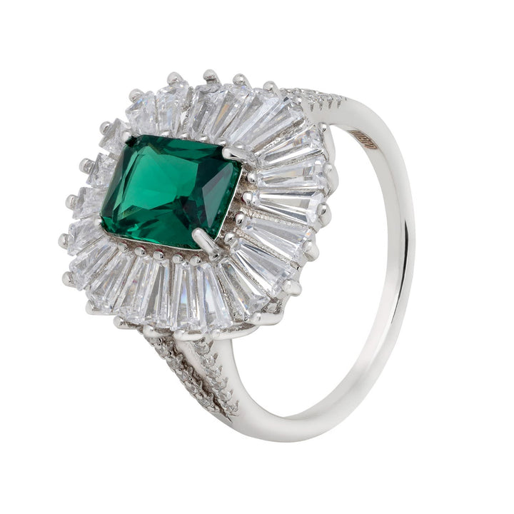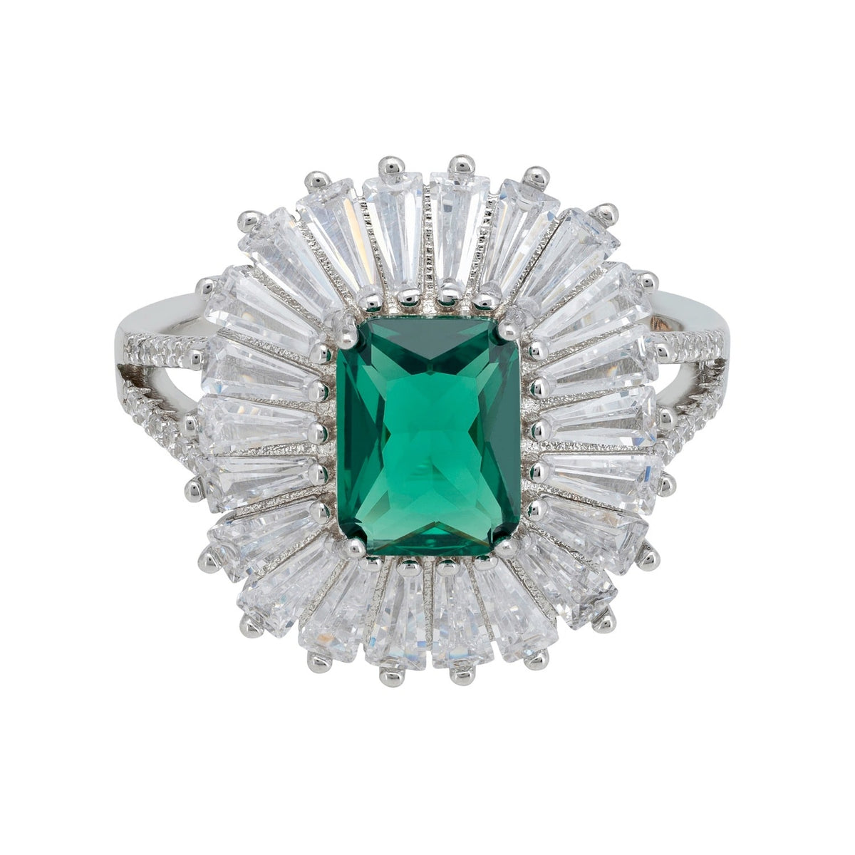 This ring is handcrafted from 925 sterling silver dipped in rhodium. It features a lab-grown emerald gemstone and simulated diamonds.