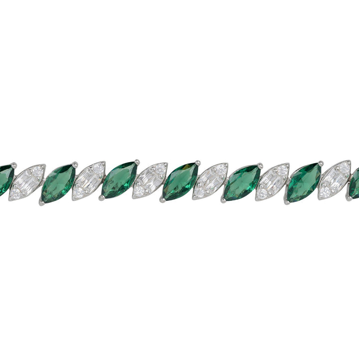 The Viscountess Tennis Bracelet Emerald Silver by Latelita is a classic yet modern piece. It features a refined showcase of lab-grown emeralds and simulated diamonds, all precision-cut in the marquise shape to beautifully reflect light. The secure fastener ensures seamless wear for any occasion.