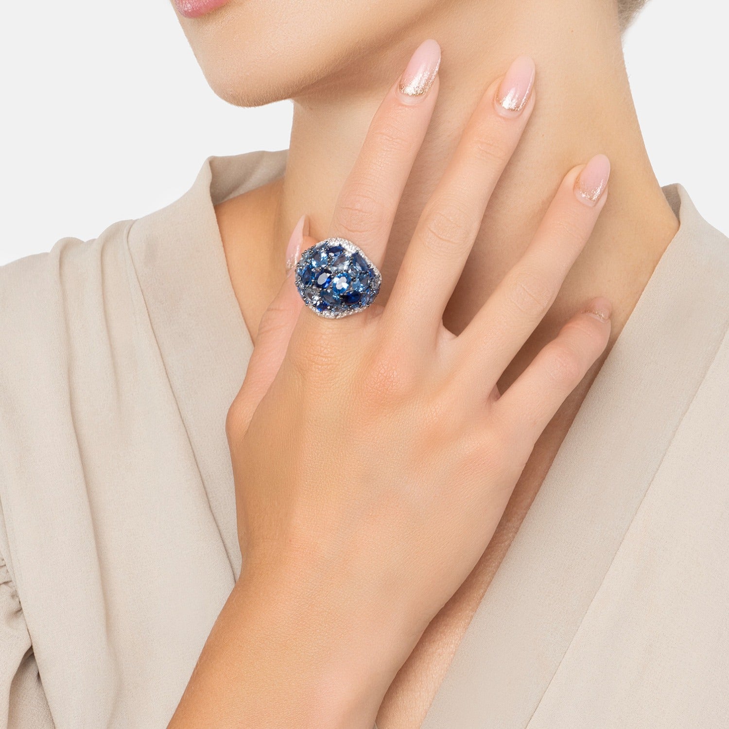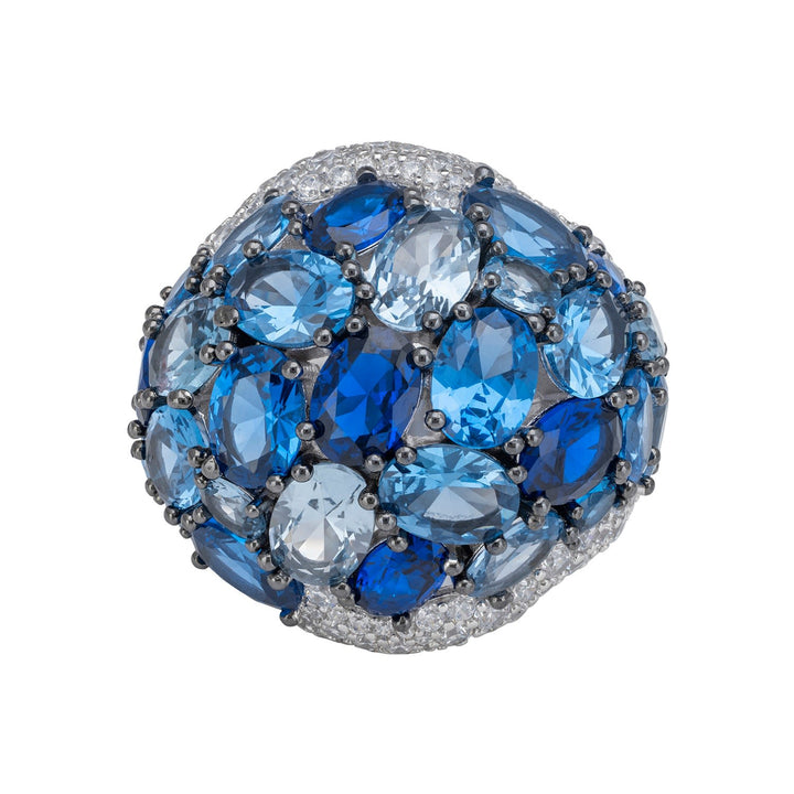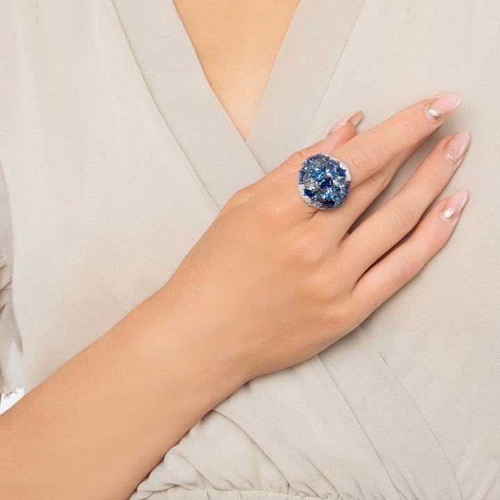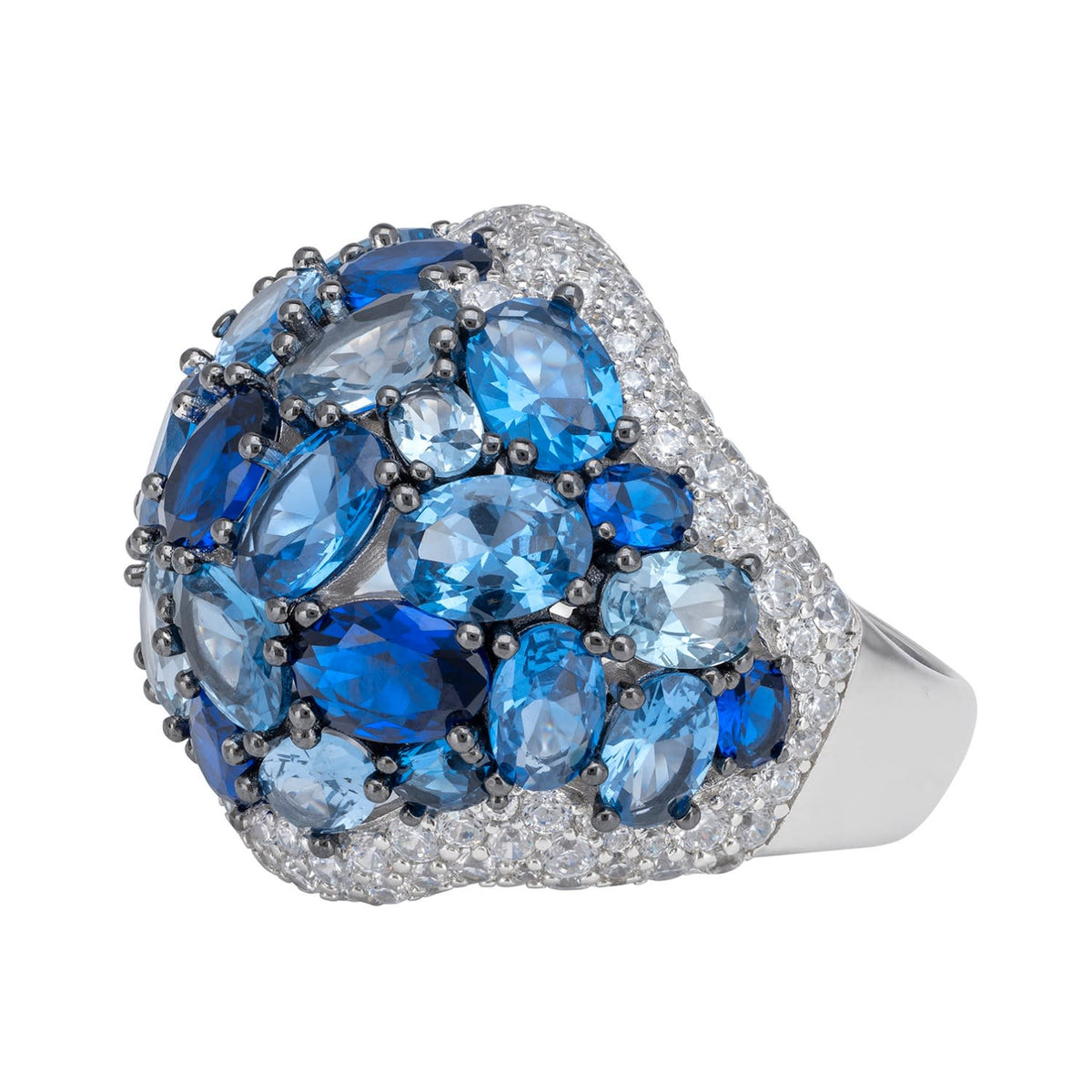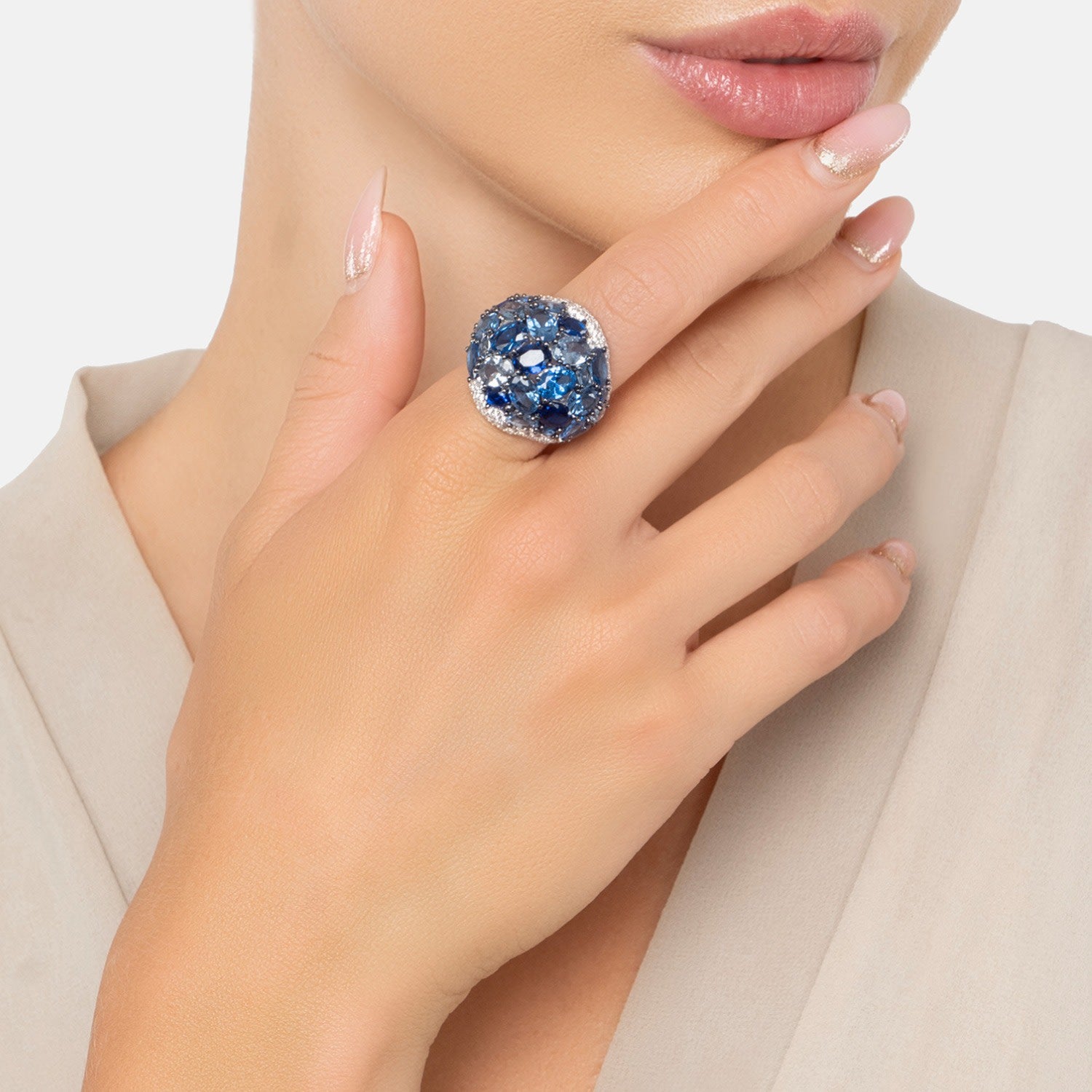 This cocktail ring is handcrafted from 925 sterling silver and is set with lab-created sapphire, blue topaz, and cubic zirconia.