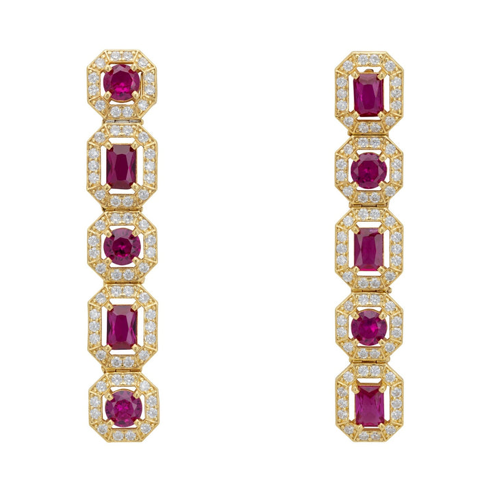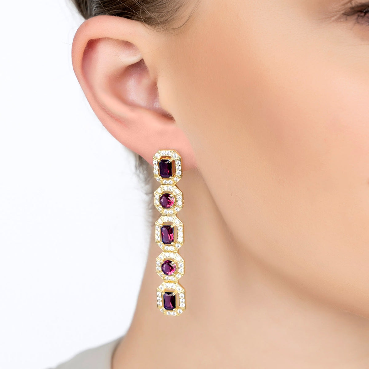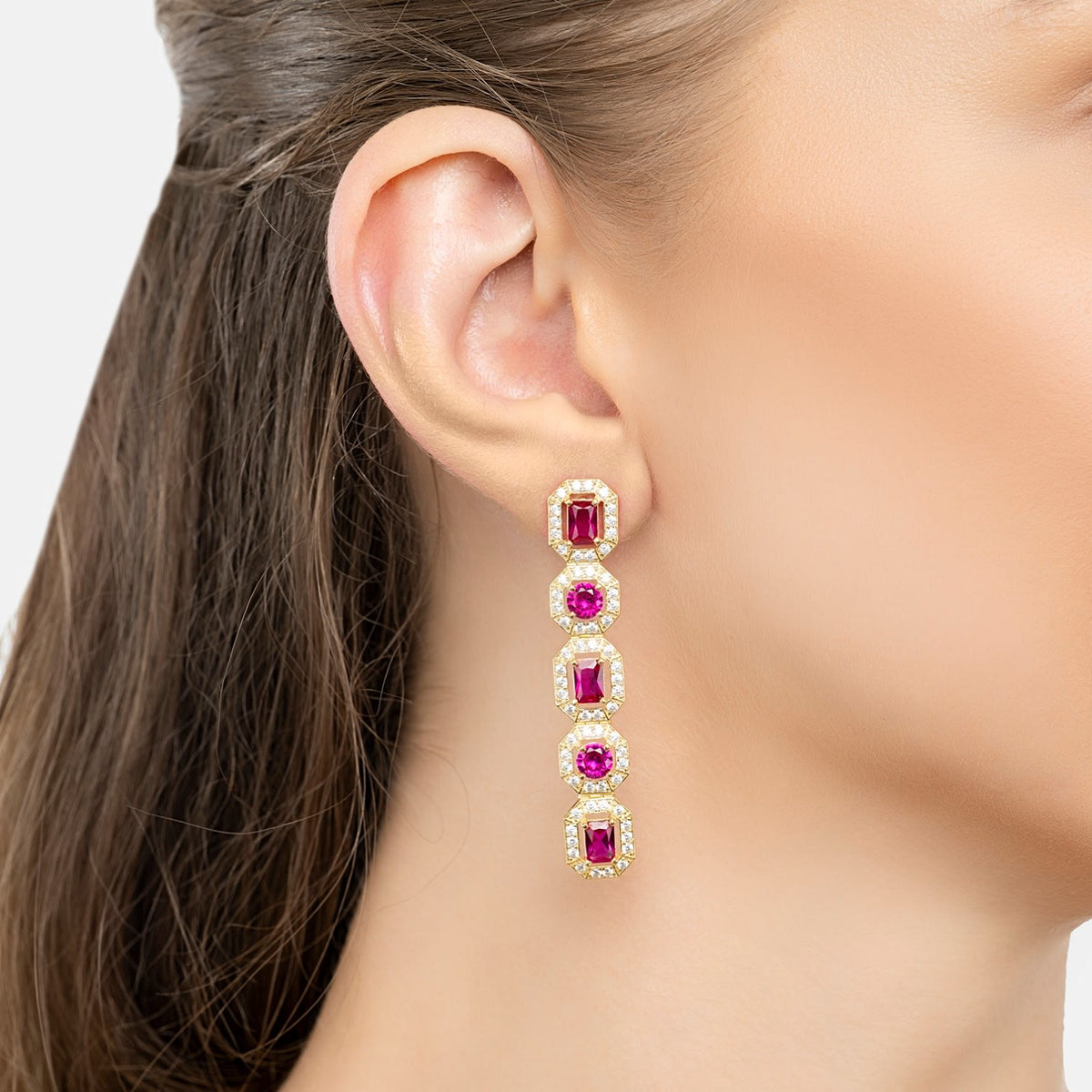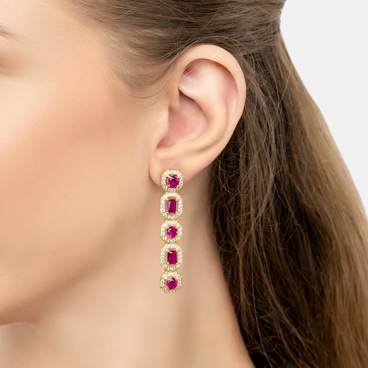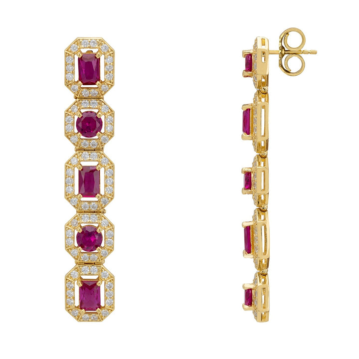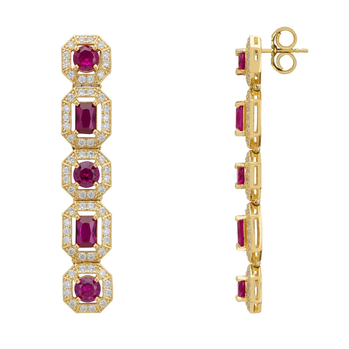 These earrings are handcrafted from 925 sterling silver with 18k gold plating. They are set with lab-grown rubies and cubic zirconia.