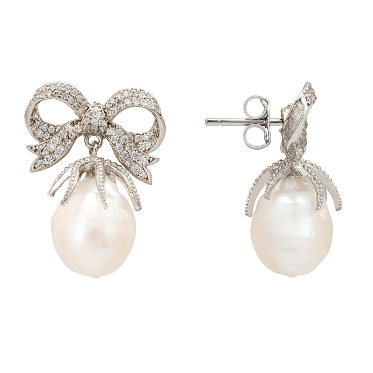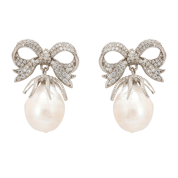 Baroque Pearl Ribbon And Bows Drop Earrings Silver