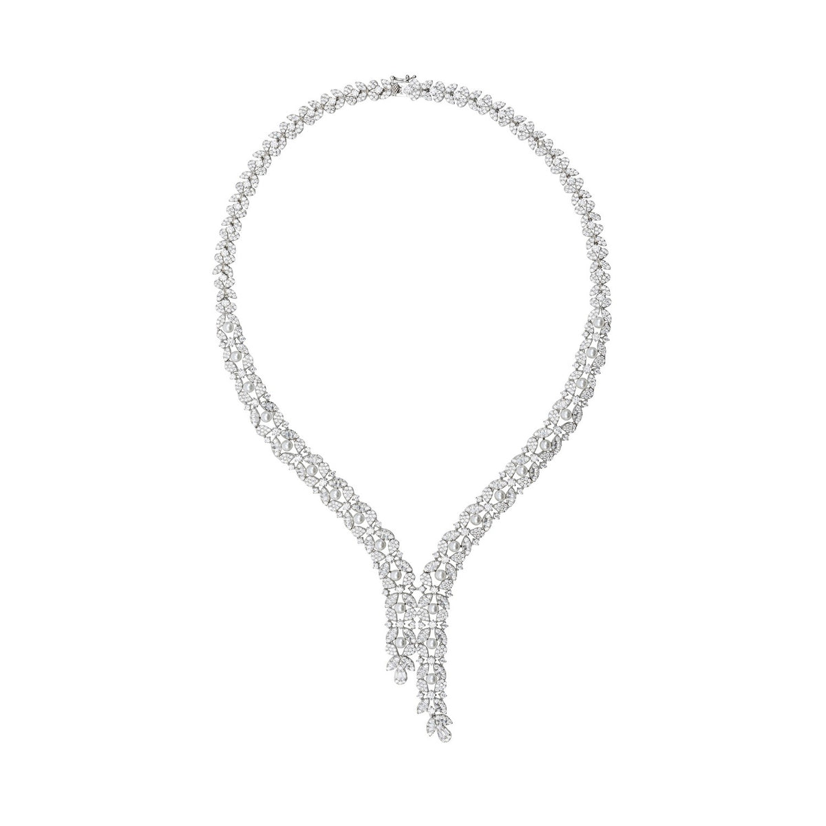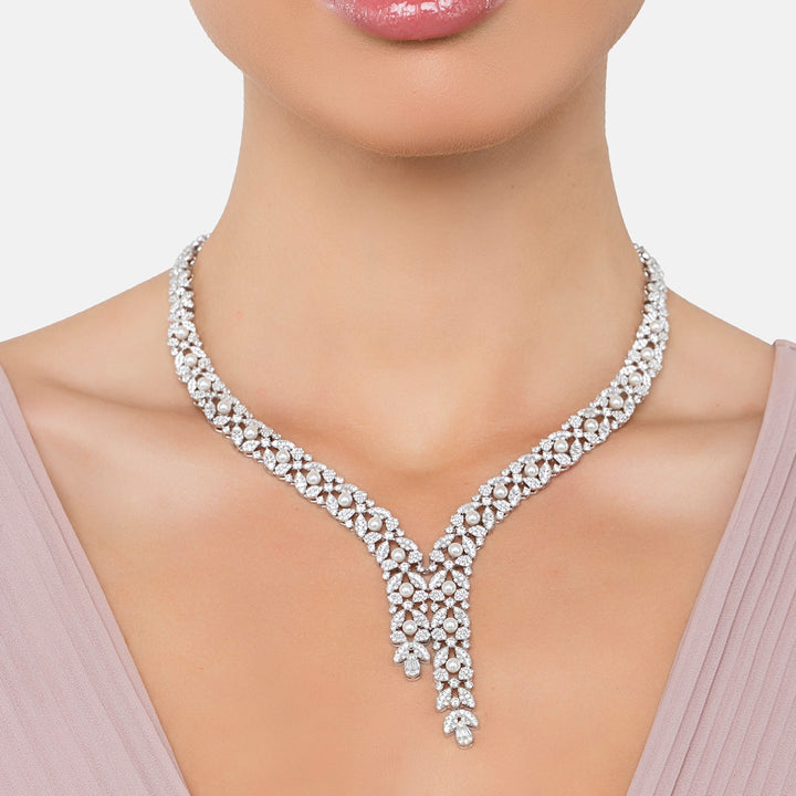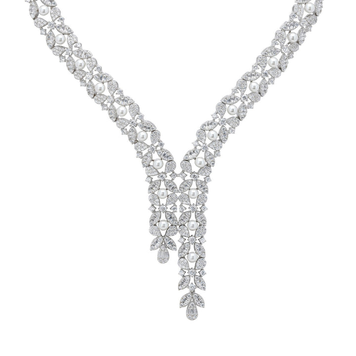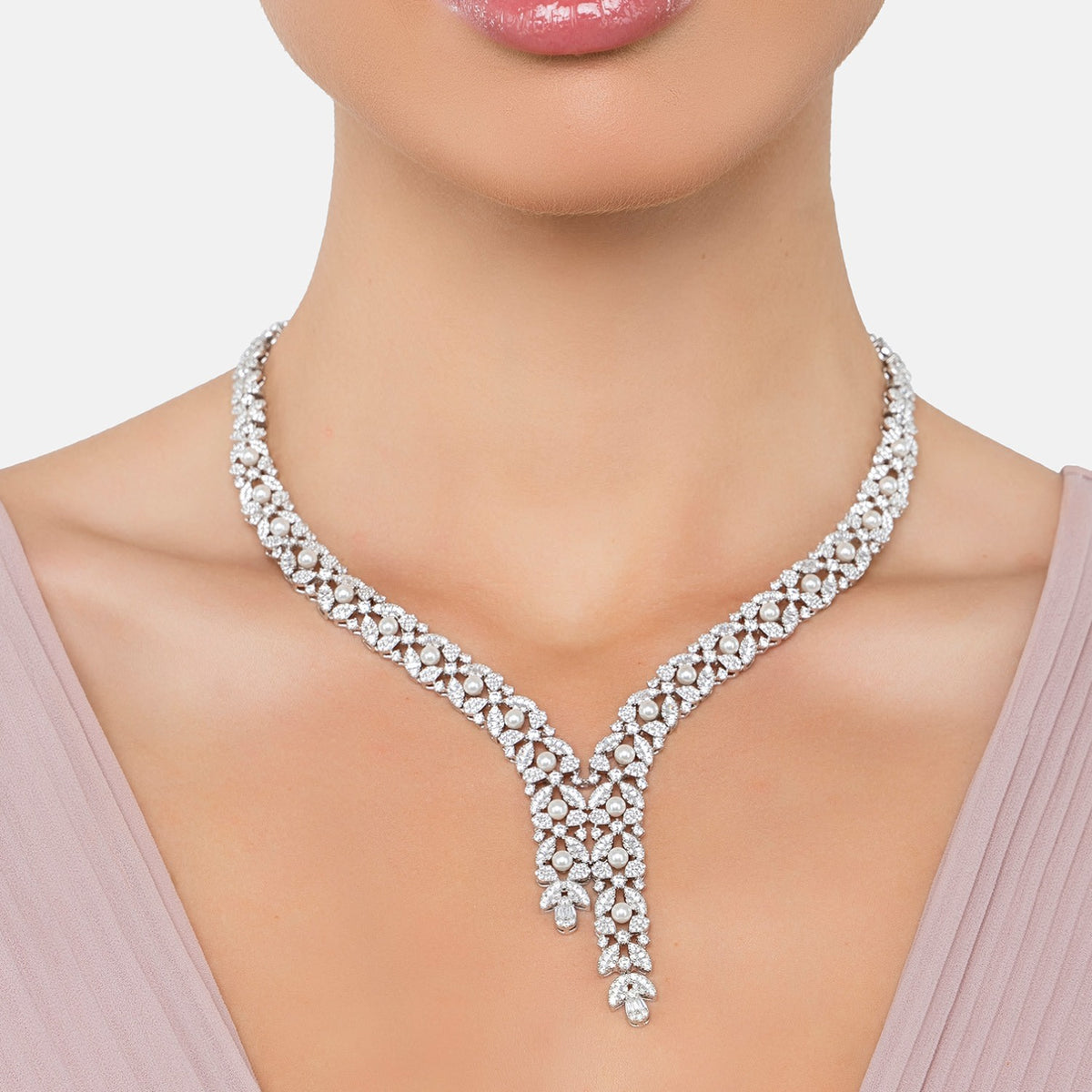 This necklace is handcrafted from 925 sterling silver, dipped in rhodium, and features Majorica pearls and simulated diamonds.