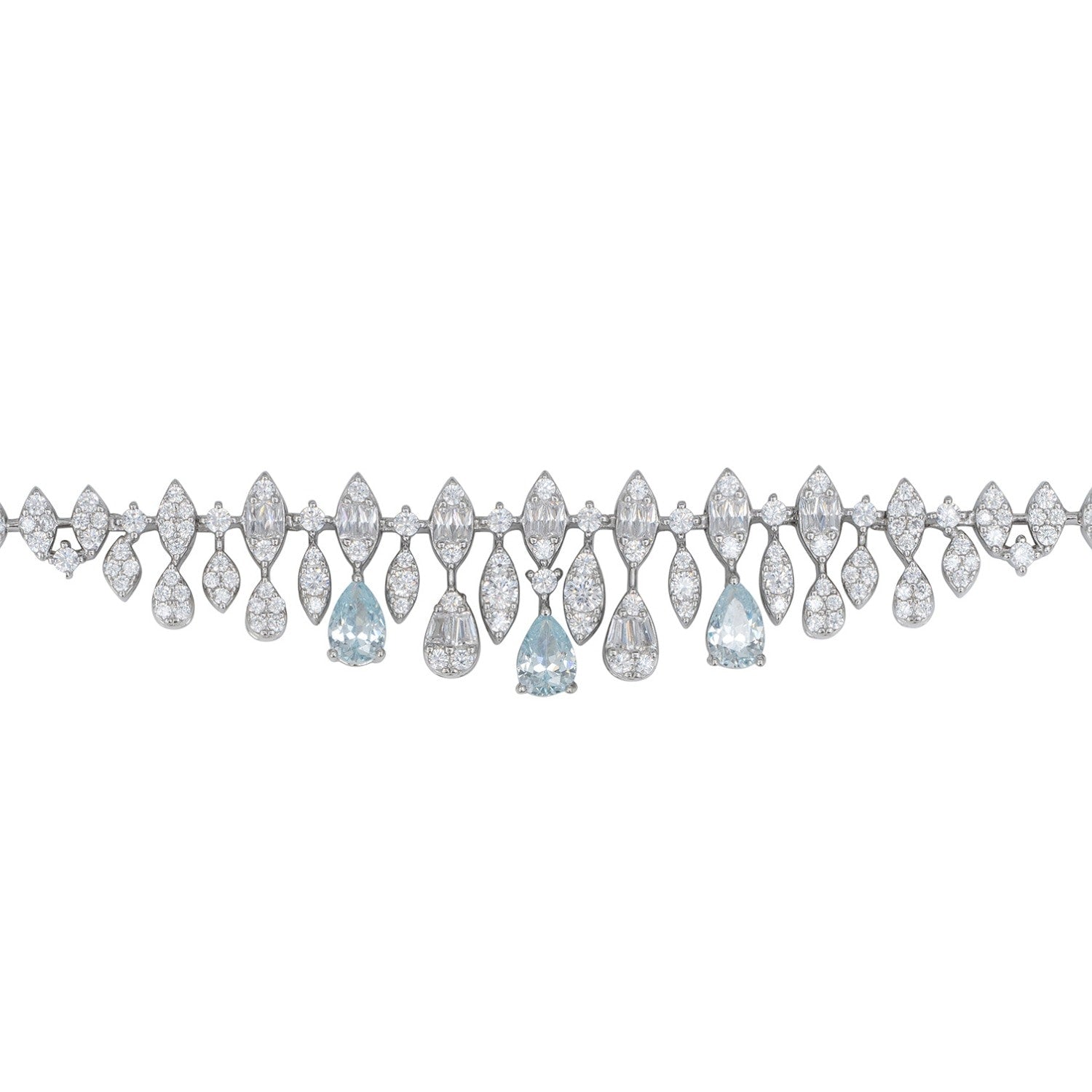 This Duchess Blue Topaz Tennis Bracelet by Latelita is a testament to timeless elegance and brilliant design. This tennis-style bracelet graces the wrist with 18 cm of brilliant simulated diamonds, arranged in a sleek and classic form. At its center, two rows of marquise-cut simulated diamonds are enhanced by a stunning third row of teardrop-shaped blue topaz gemstones, each framed by dazzling diamond simulants. This piece is a beautiful statement of enduring sparkle, perfect for elevated moments.