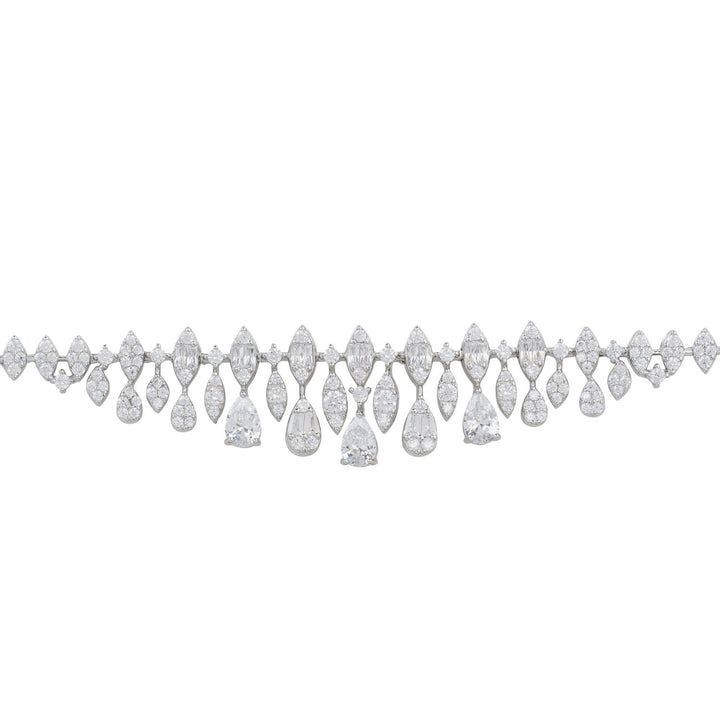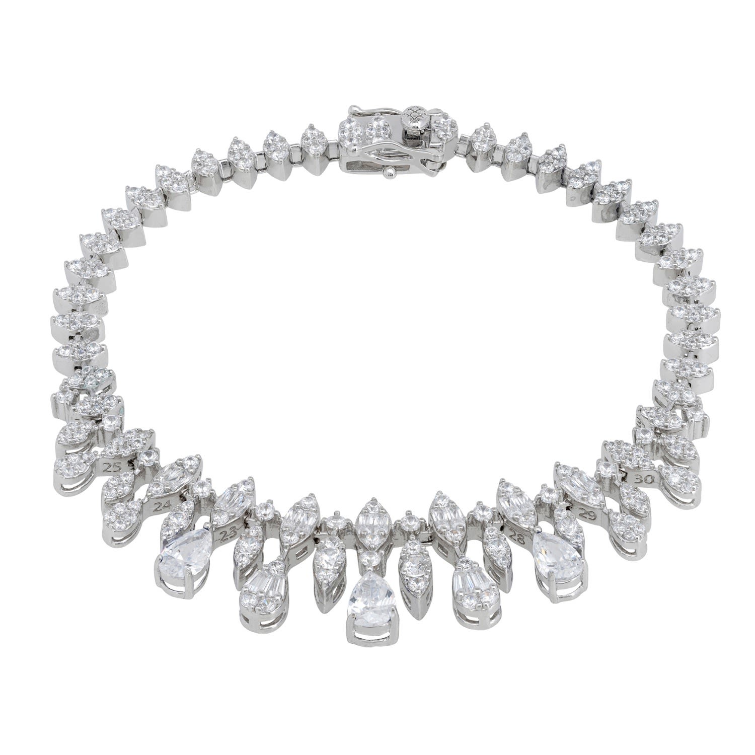 This Duchess Moissanite Tennis Bracelet by Latelita is a testament to enduring sparkle and elegant design. The bracelet features brilliant simulated diamonds arranged in a sleek, classic tennis-style form. At the center, two rows of marquise-cut simulated diamonds are enhanced by a third row of teardrop-shaped moissanite stones. This bracelet is a luxurious accessory perfect for special occasions like weddings and galas.