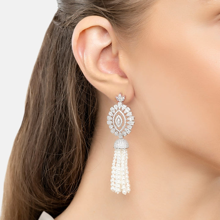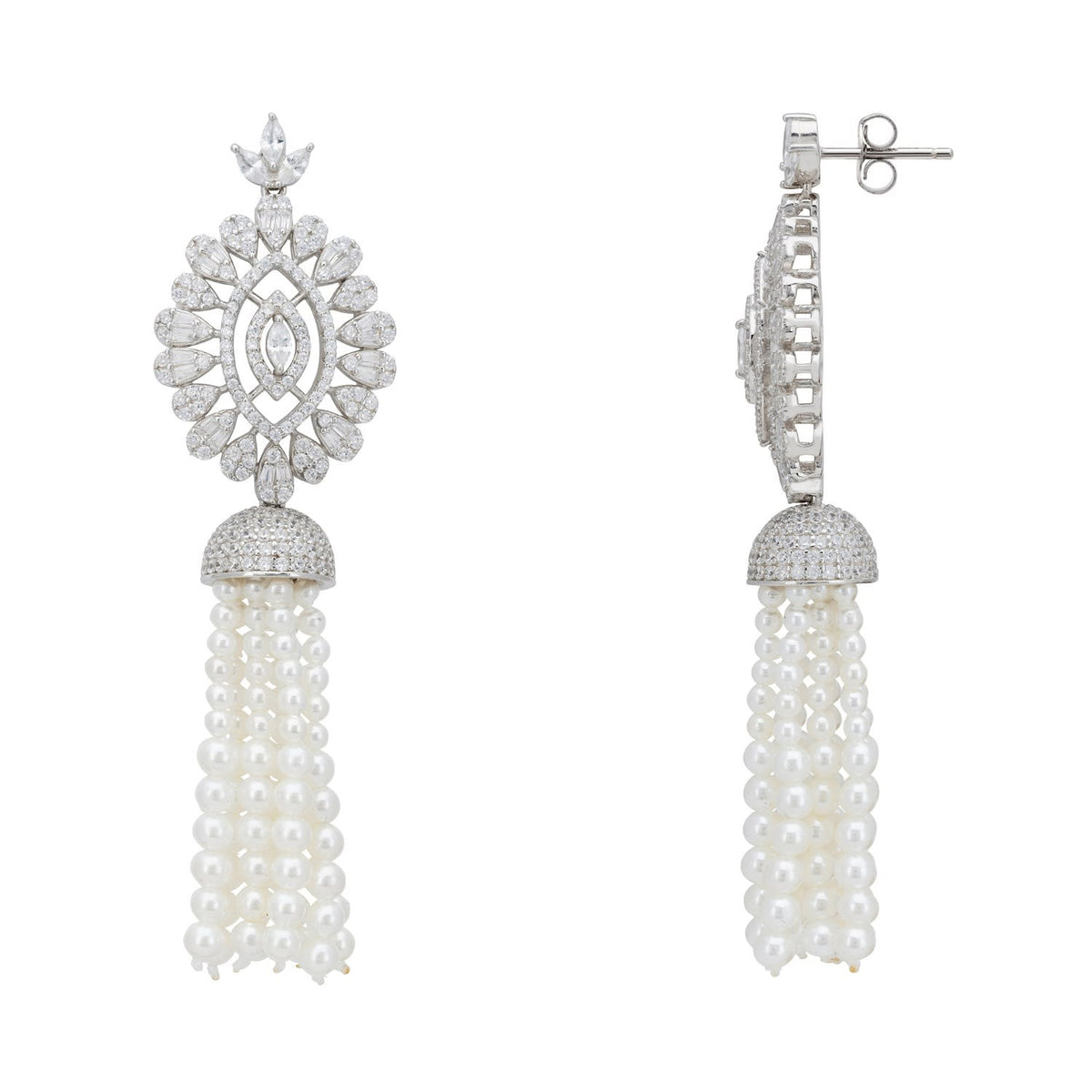 These tassel drop earrings are handcrafted from .925 sterling silver and feature cubic zirconia and small, round Majorica pearls.