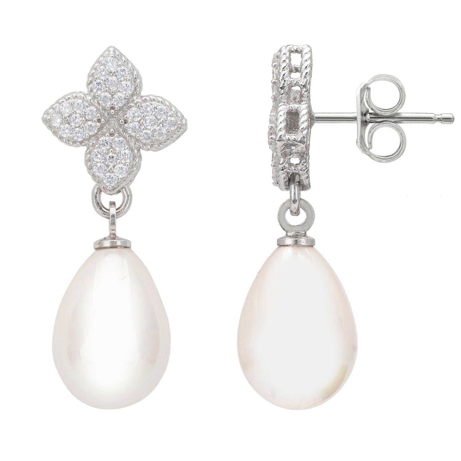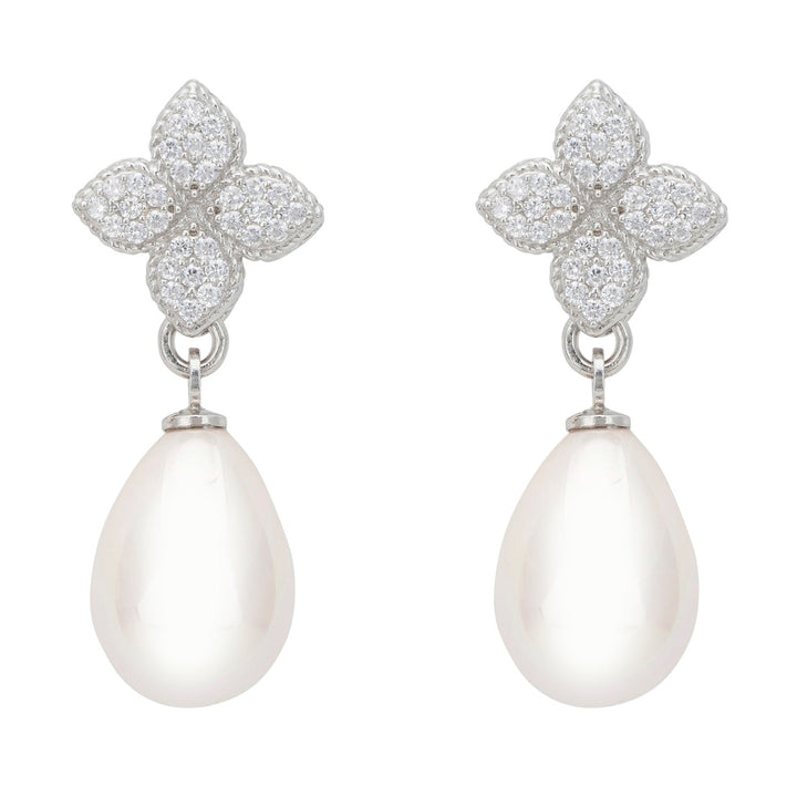 These Clover Flower Pearl Drop Cz Earrings Silver by Latelita offer a timeless, cool-toned elegance that complements any wardrobe. The three-dimensional clover, symbolizing good fortune, is adorned with glistening cubic zirconia, while a teardrop Majorica pearl hangs below, radiating a smooth and luminous glow. Pearls, as the birthstone for June, represent grace, love, and new beginnings, making these earrings a meaningful gift and a beautiful heirloom in the making.