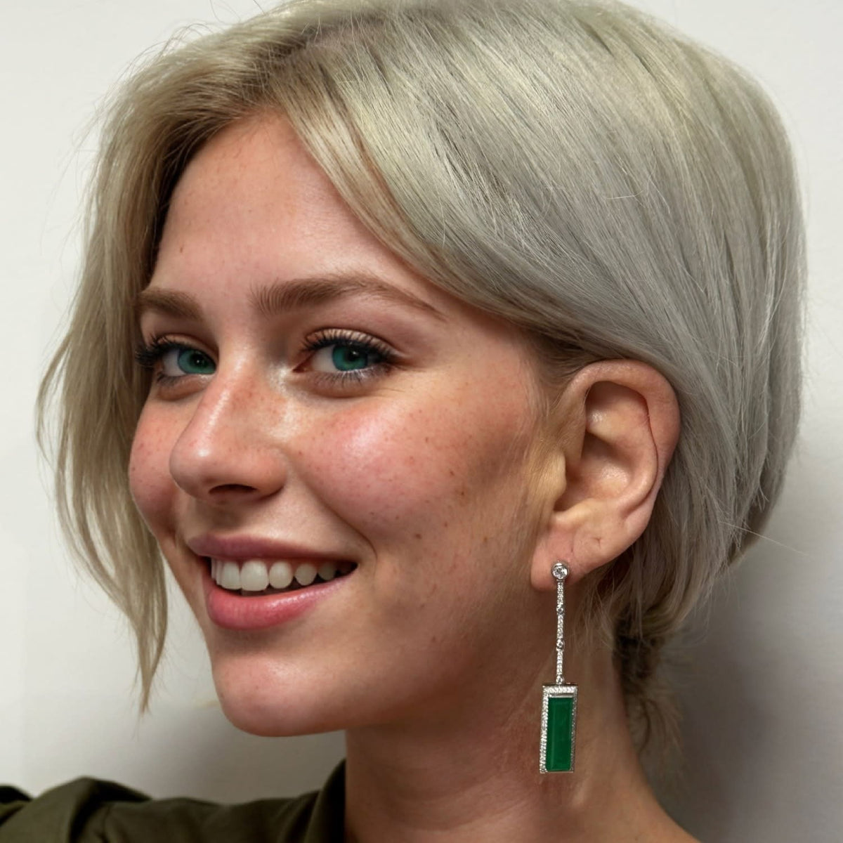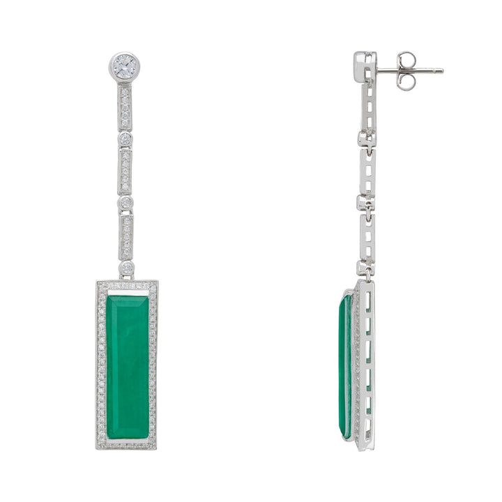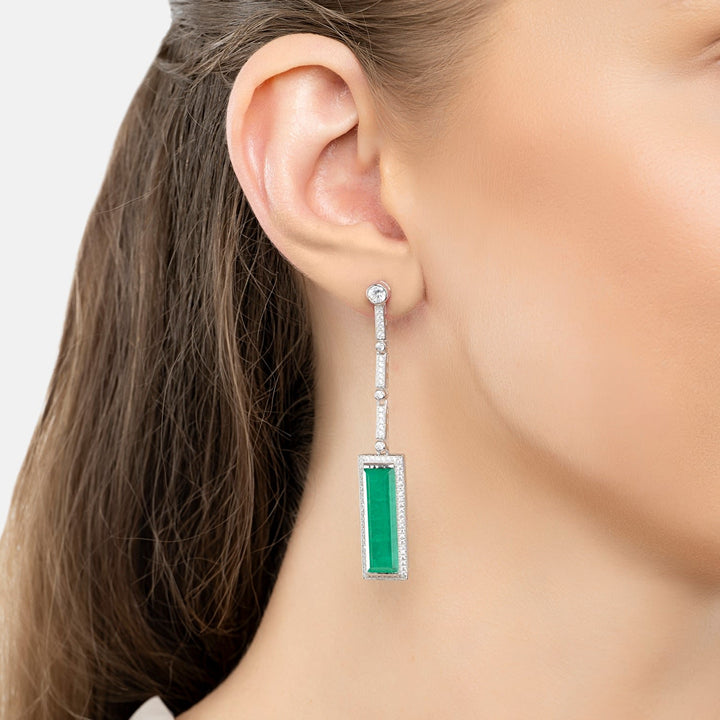 These earrings are handcrafted from 925 sterling silver, dipped in rhodium, and set with a lab-grown Colombian emerald and cubic zirconia.