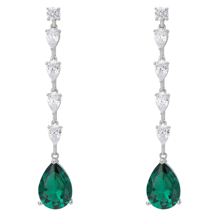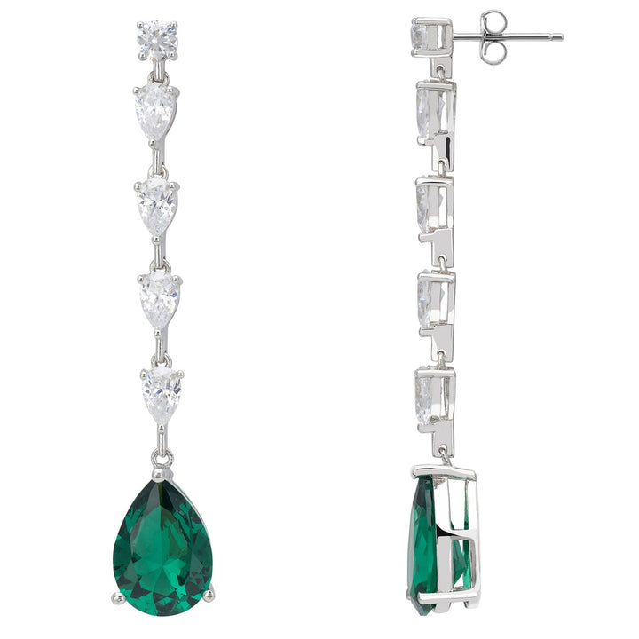 These drop earrings are handcrafted from .925 sterling silver dipped in rhodium and feature a lab-grown emerald gemstone and simulated diamonds.