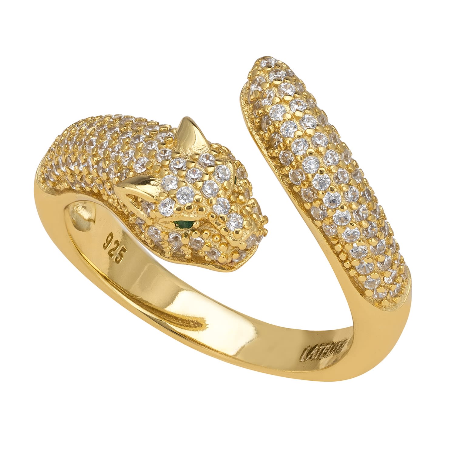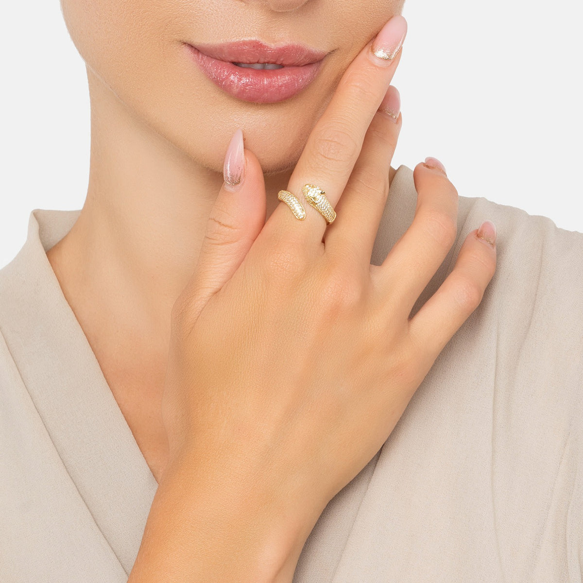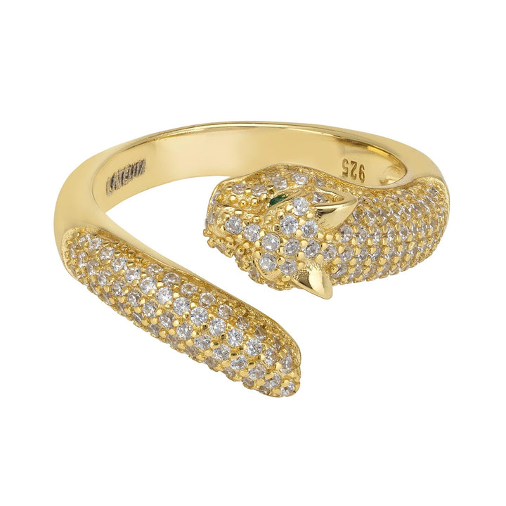 This Jaguar Cocktail Ring Gold by Latelita is a fierce and unapologetically bold statement piece. Capturing the spirit of the majestic jaguar, the design winds elegantly around the finger, its sleek form encrusted with clear cubic zirconia for a dazzling finish. The vivid green zircon eyes add a touch of danger and drama. This ring symbolizes power, protection, and confidence, making it an ideal choice for someone whose style is as fearless as they are.