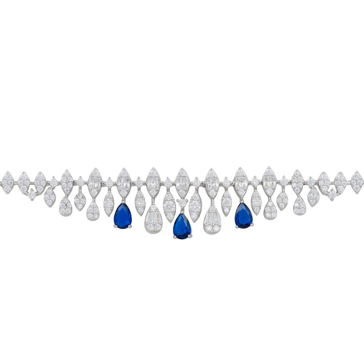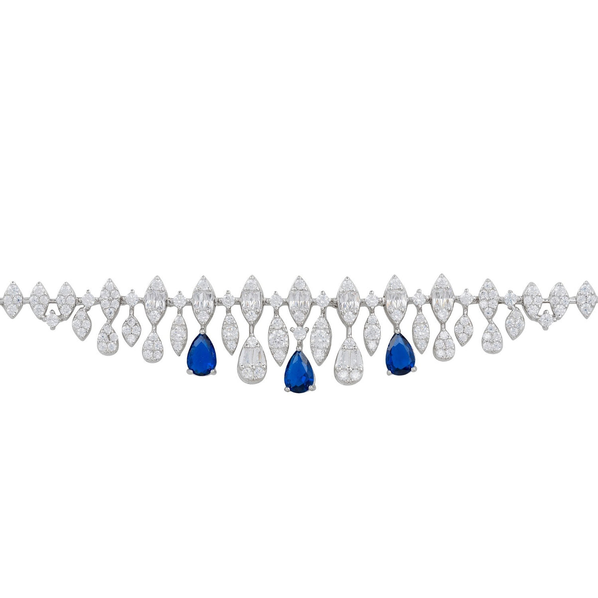 This Duchess Sapphire Tennis Bracelet Silver by Latelita is a refined and regal accessory that captures the essence of timeless elegance. Following the graceful contour of your wrist, a full row of simulated diamonds creates a dazzling tennis-style silhouette. The addition of lab-grown sapphires and teardrop diamonds at the center adds a touch of sophistication and grandeur, making this bracelet a perfect "something blue" for a wedding or a special evening affair.