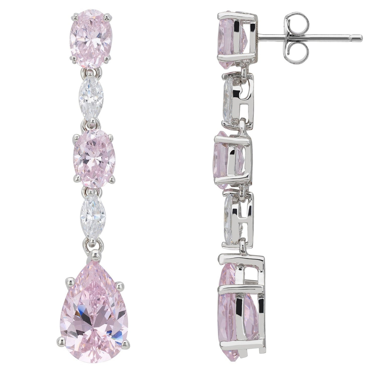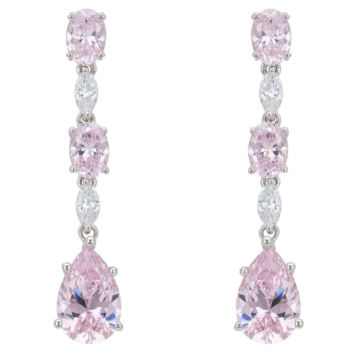 These drop earrings are handcrafted from .925 sterling silver dipped in rhodium. They feature lab-grown morganite and simulated diamonds.