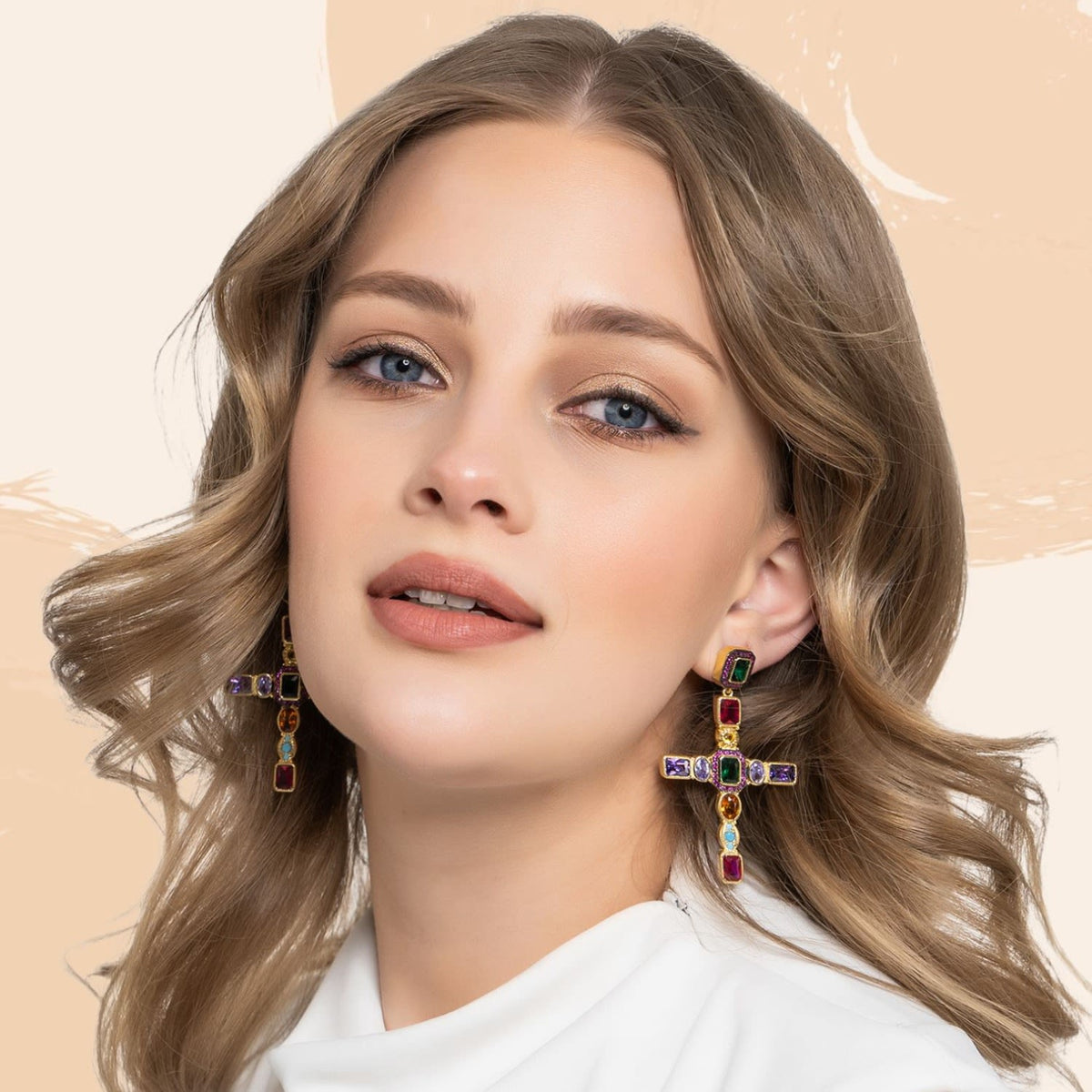 These Santa Maria Extra Large Gemstone Cross Earrings Gold by Latelita are a bold and spiritual statement piece. Adorned with a mosaic of vibrant lab-grown gemstones, including turquoise, amethyst, ruby, and emerald, these extra-large cross earrings are a vivid and artistic expression of faith. The cross symbolizes protection, making these not only a fashion statement but also a piece with deeper significance.