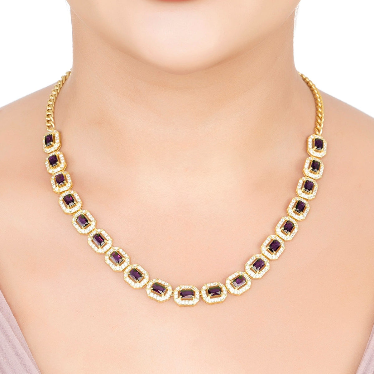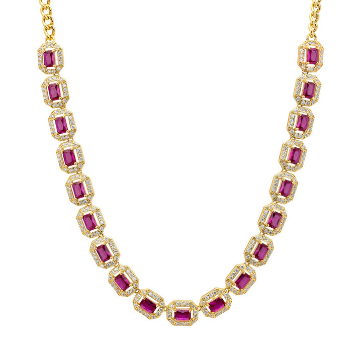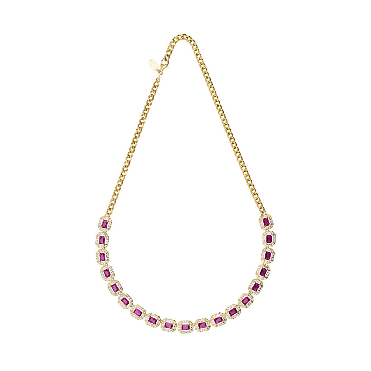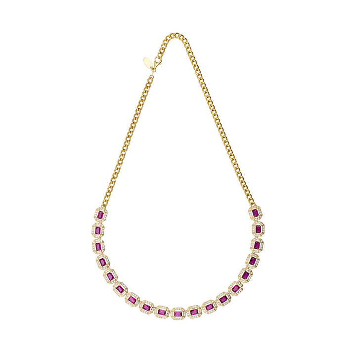 The Whistledown Ruby Gemstone Necklace is a piece of effortless elegance. It features a captivating row of lab-grown rubies, each surrounded by sparkling cubic zirconia. The necklace transitions seamlessly into a gold curb chain, offering a comfortable and confident fit for both special occasions and daily wear.