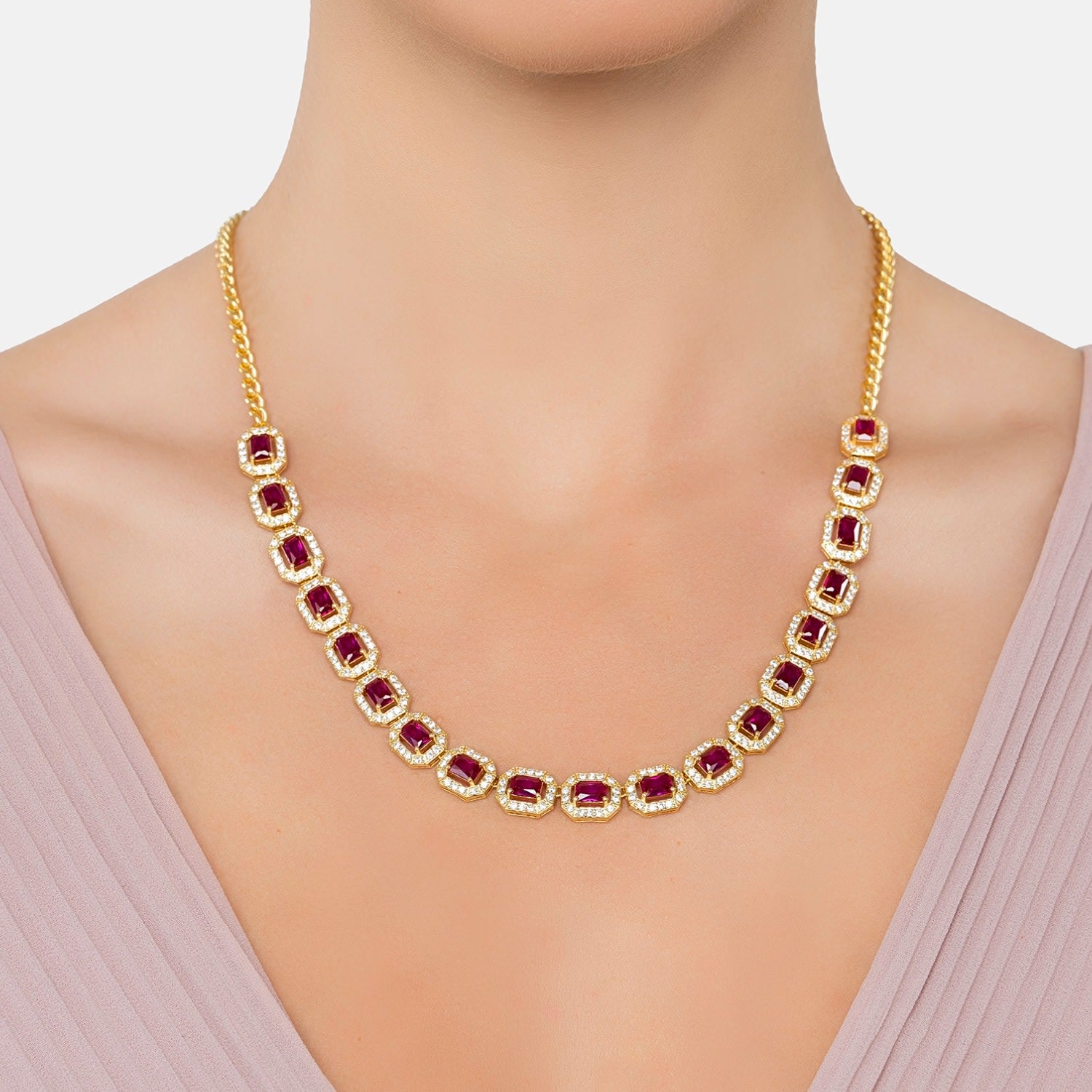 This necklace is handcrafted in 925 sterling silver dipped in 18ct gold and set with lab-grown ruby and cubic zirconia.