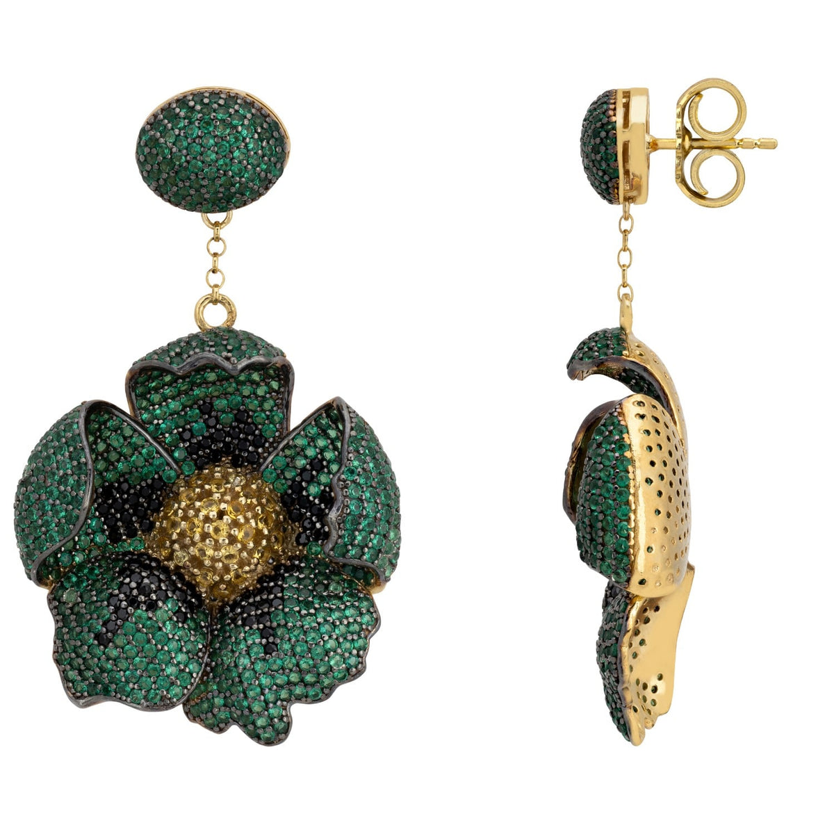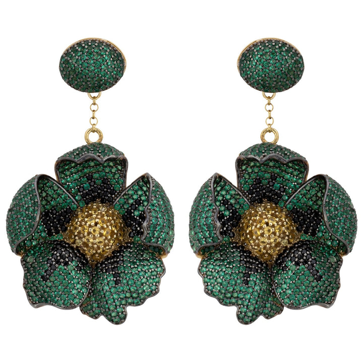 The Poppy Flower Drop Earrings Emerald Gold are a stunning celebration of nature's beauty. Inspired by the delicate poppy flower, each petal is adorned with sparkling green cubic zirconia, with subtle black accents and a vibrant yellow center. These earrings are a joyful and confident statement piece that tells a story of beauty and individuality.