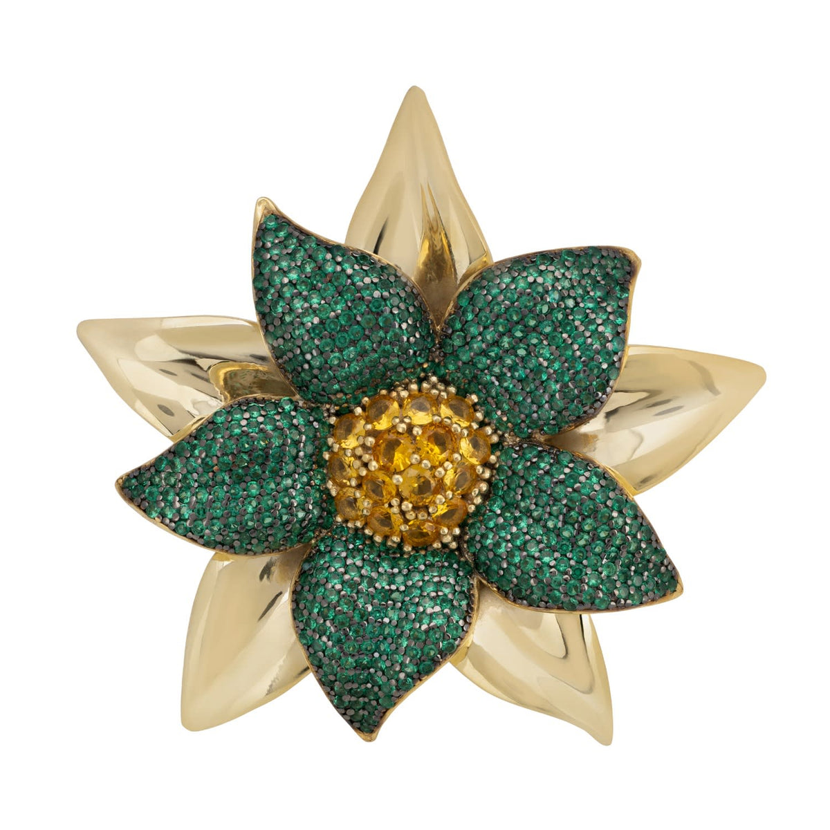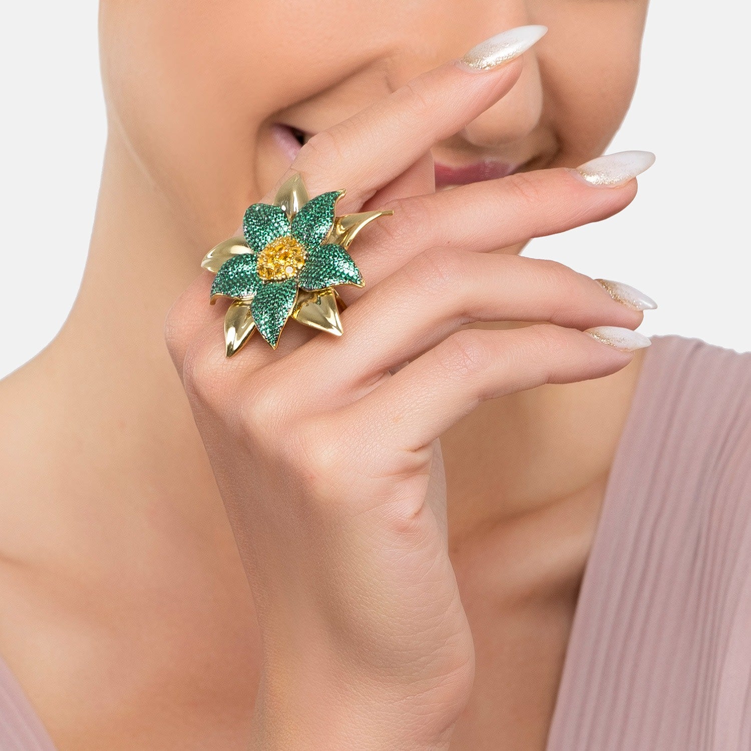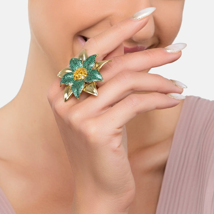 The Marguerite Daisy Flower Cocktail Ring Emerald Gold is a statement piece rooted in nature and elegance. Inspired by the daisy, it features petals set with lush emerald-green cubic zirconia and polished gold petals, with a center of vibrant yellow zirconia. This adjustable ring reflects inner vibrance and adds a fresh, botanical elegance to your look.