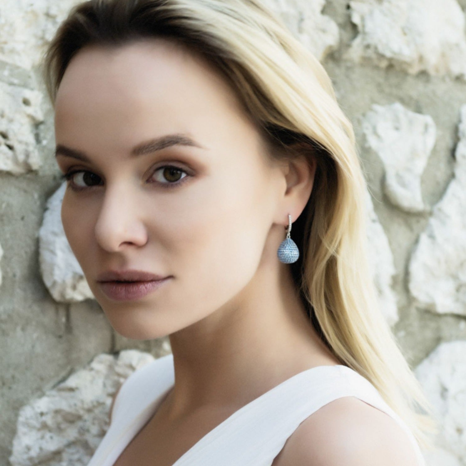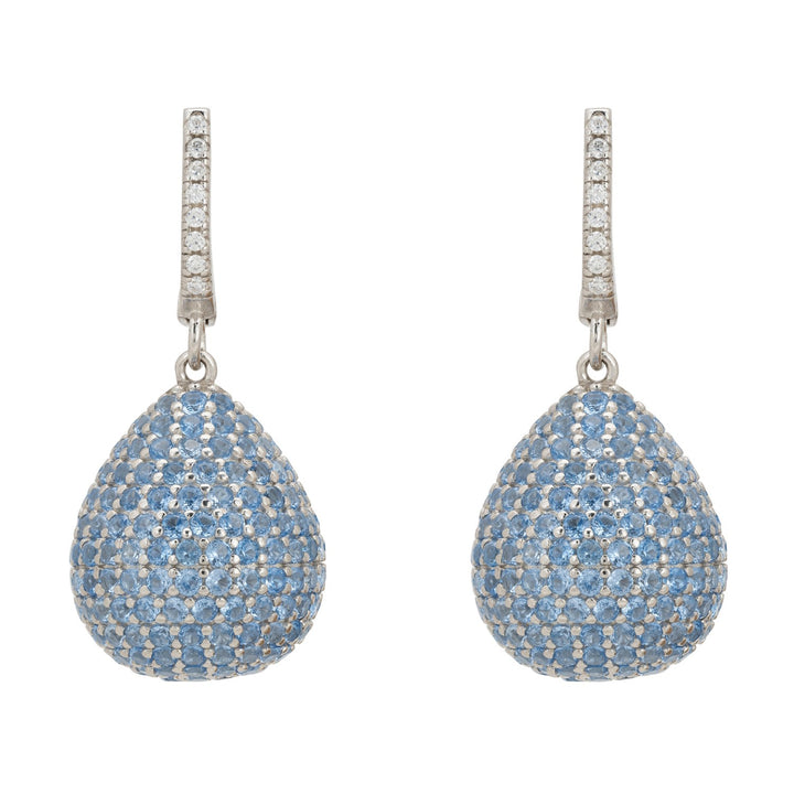 The Valerie Pear Drop Gemstone Earrings Silver Ice Blue are a hypnotic and dazzling statement piece. The brilliant-cut pear drop orb is set with an array of sparkling ice blue cubic zirconia, suspended from a zircon-adorned creole fastening. These earrings add a striking pop of color and are perfect for bridal wear or elegant cocktail attire.