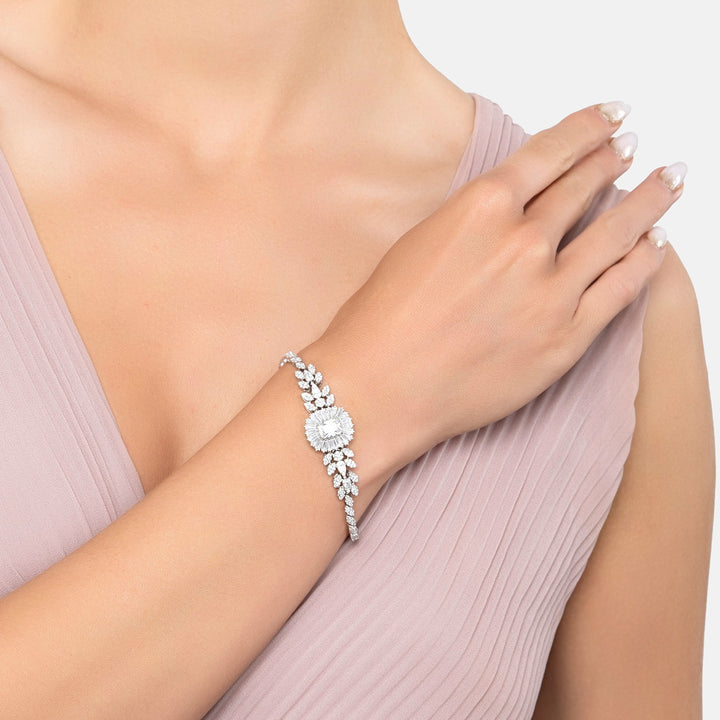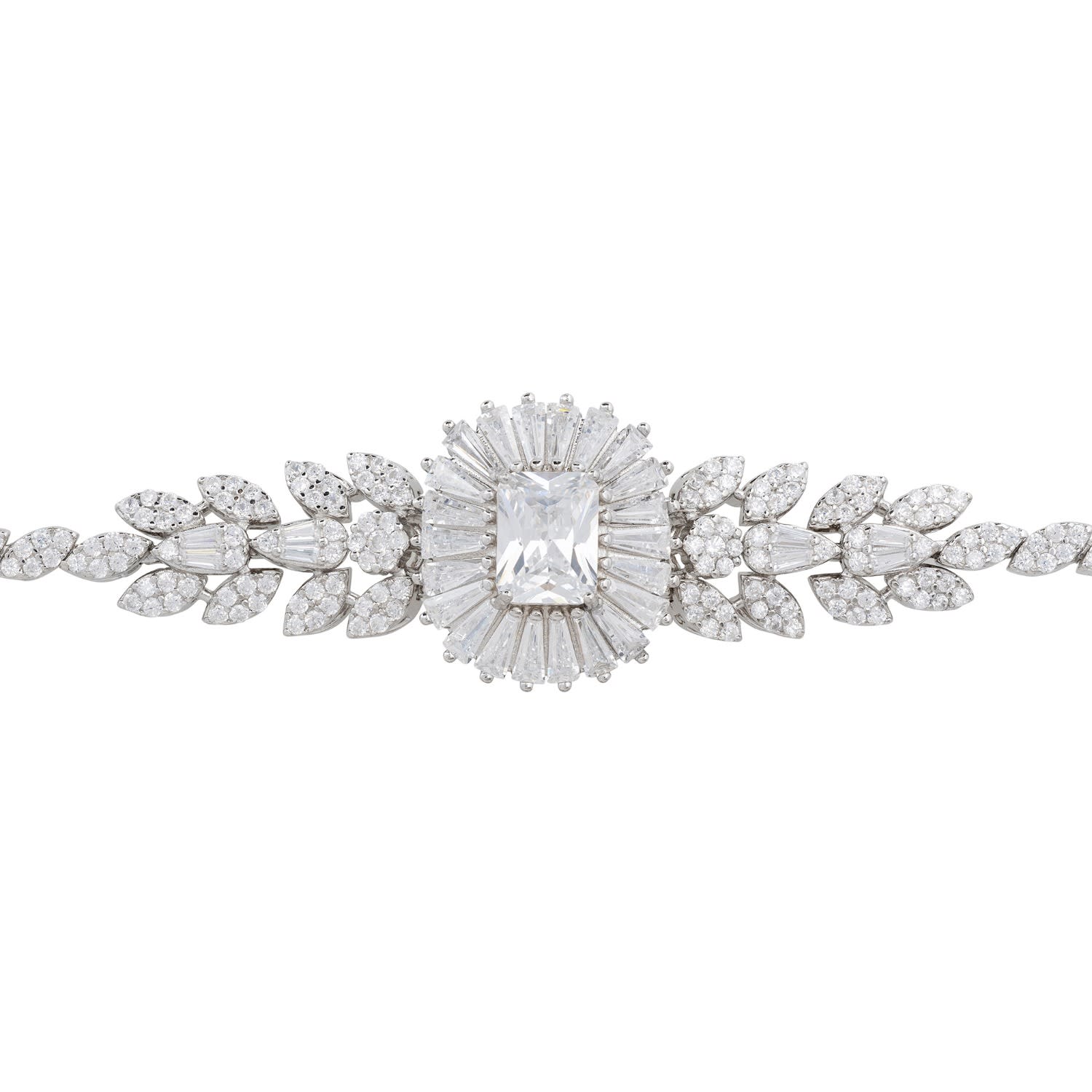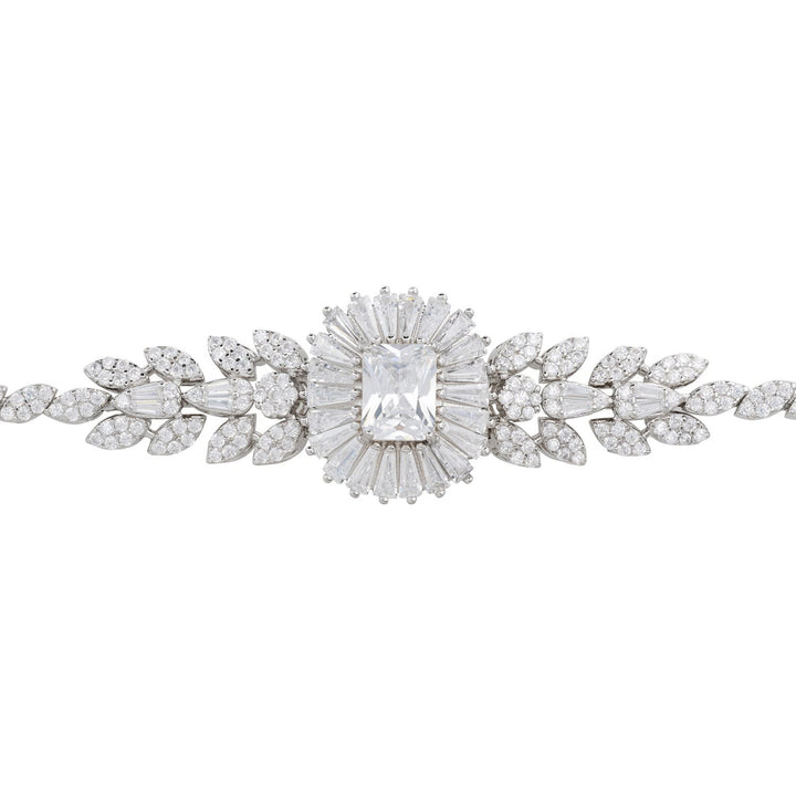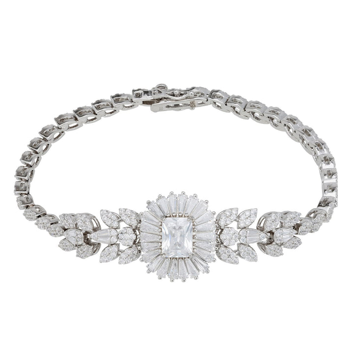 The Countess Gemstone Bracelet is a glamorous tennis bracelet designed for maximum impact. It is lined entirely with simulated diamonds with a lab-grown moissanite centerpiece surrounded by baguette brilliance. Handcrafted in 925 sterling silver and dipped in rhodium, this bracelet is a "full-blown sparkle fest."