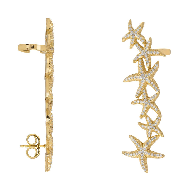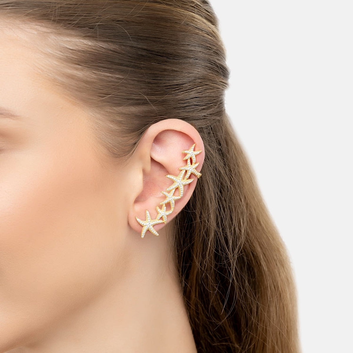 The Starfish Ear-Climber is a unique and shimmering accessory. Designed to trace the graceful curve of the left ear, this single ear climber features a line of starfish in varying sizes. Each golden limb is set with cubic zirconia stones, creating a dynamic sense of movement and symbolizing renewal and infinite hope.