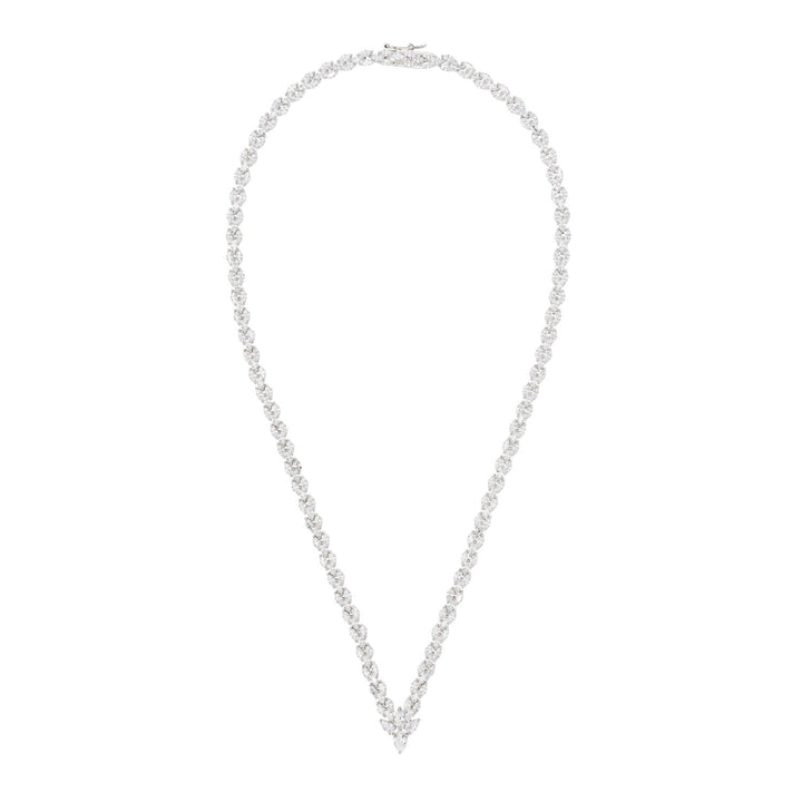 The Petal Tennis Necklace is an elegant and feminine choker that makes you sparkle. Crafted from 925 sterling silver, this necklace is adorned with ultra-sparkling simulated diamonds in a petal design that culminates to a point at the base of the neck. It's an ideal accessory for special events like weddings or black-tie affairs.