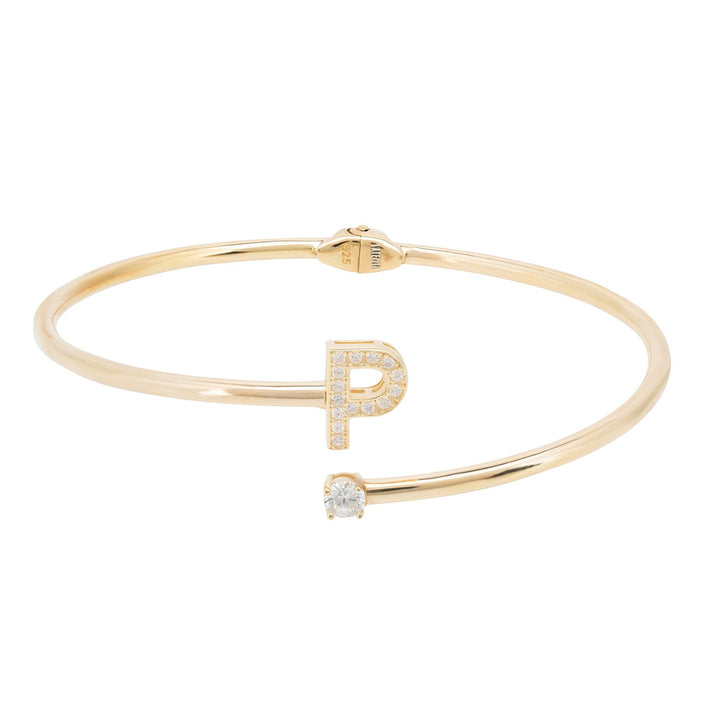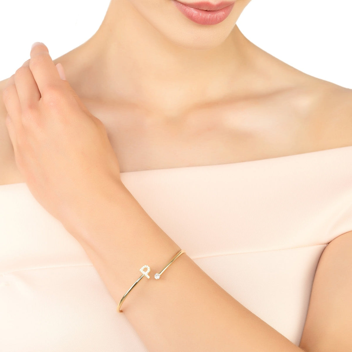 This Initial Bangle Gold P by Latelita is a simple yet beautifully styled piece, perfect for those who covet delicate and personal jewelry. The open cuff design features a sparkling cubic zirconia-adorned monogram on one side and a single larger cubic zirconia on the other. With its elegant sparkle and personal touch, this bangle makes a perfect personalized gift for a birthday or a bridesmaid.