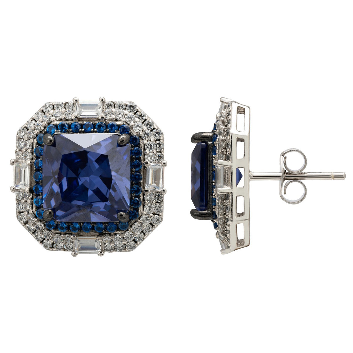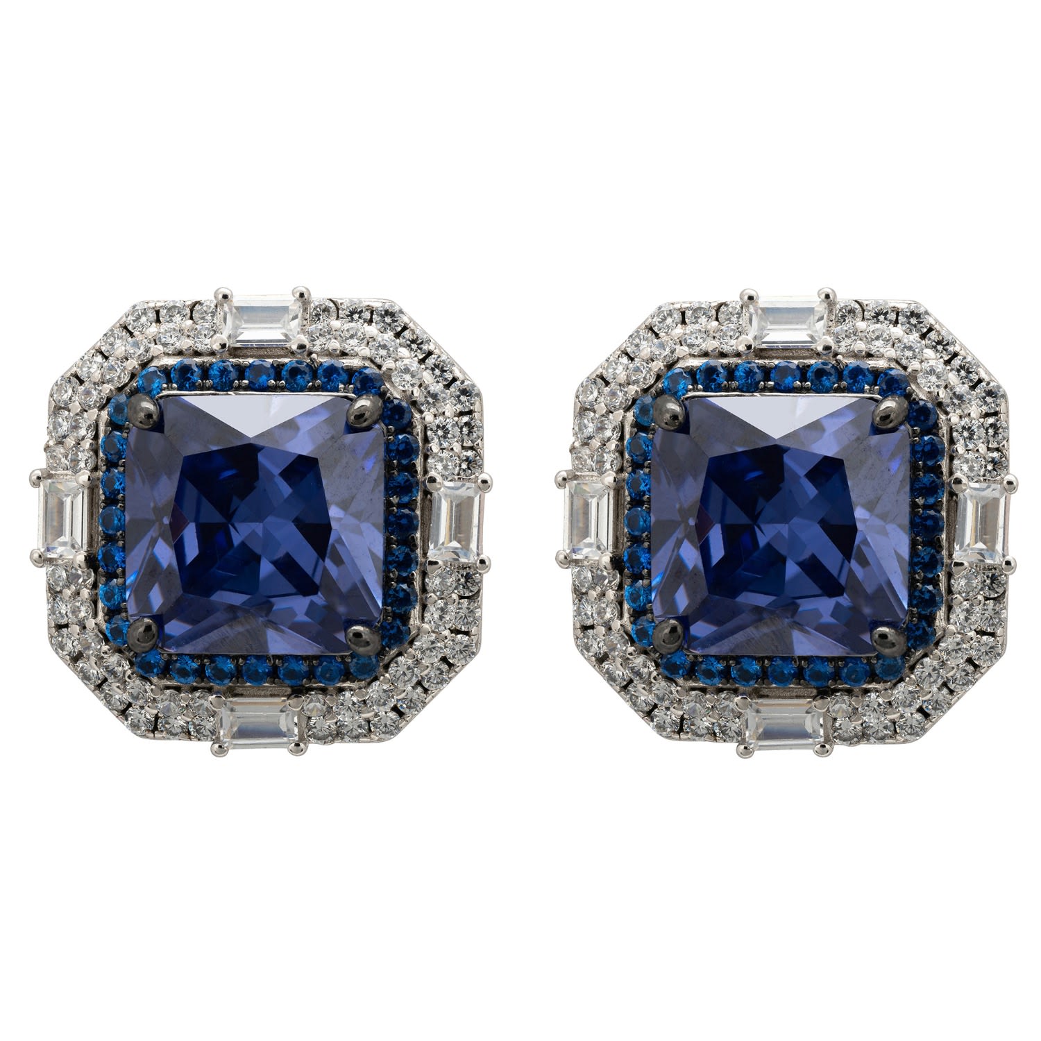 These Madeleine Large Stud Earrings Silver Tanzanite by Latelita are a stunning and dramatic accessory. The beautifully crafted 925 sterling silver earrings feature large, square-cut lab-created tanzanite gems. The gems are adorned with deep blue cubic zirconia and two rows of dazzling simulated diamonds, creating a look that is both eye-catching and glamorous. These earrings symbolize prestige and sophistication, making them a perfect gift for someone you cherish.