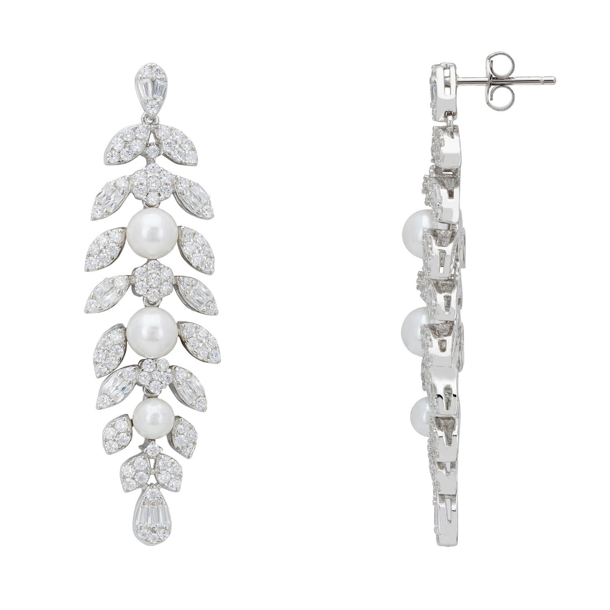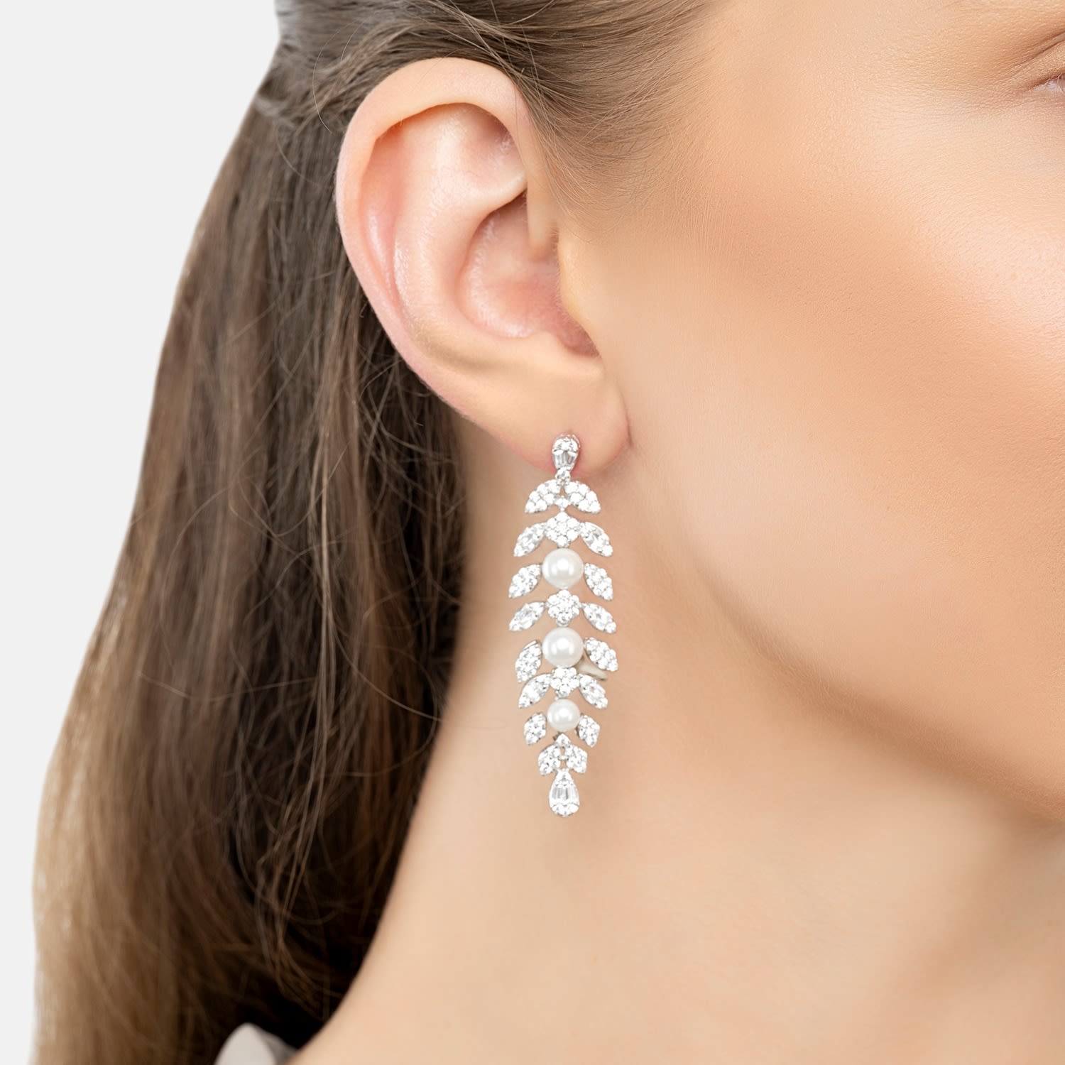 The Empress Pearl Petal Drop Earrings by Latelita are designed to move with elegance and meaning. These earrings feature a graceful drop with simulated diamond-encrusted petals and three radiant Majorica pearls nestled among them. The intricate floral design and luminous pearls frame the face with a soft, romantic glow, making them a stunning choice for bridal wear or any extraordinary occasion.