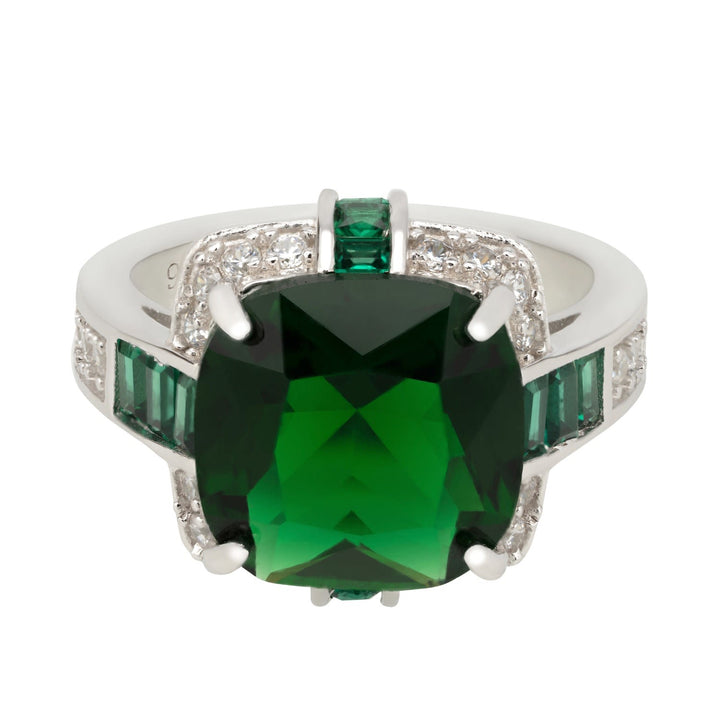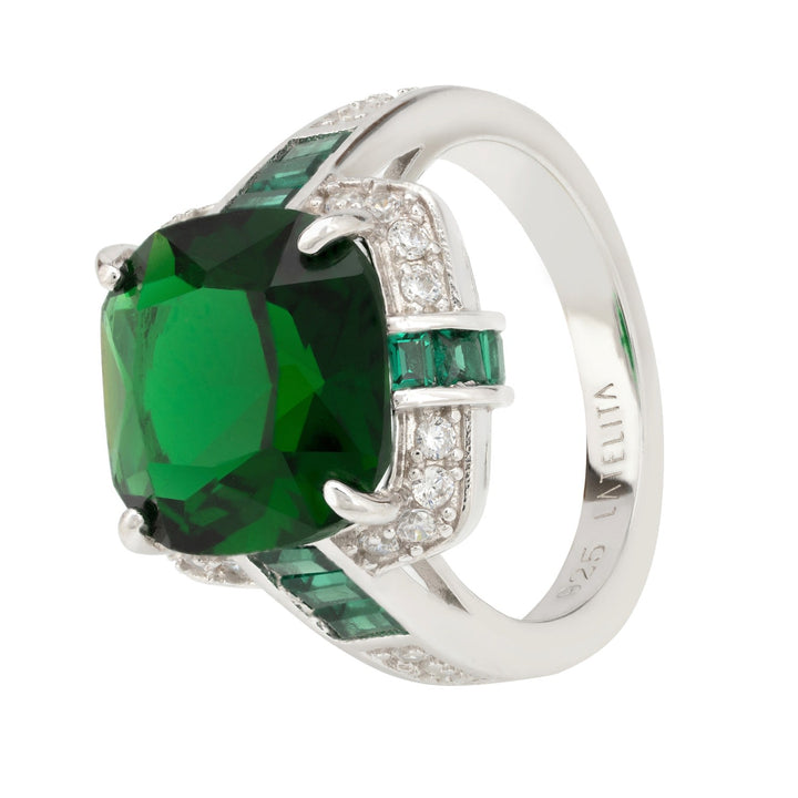 This cocktail ring is handcrafted from 925 sterling silver. It features a lab-grown cultured emerald and cushion-cut emeralds, and zirconia. It is presented in Latelita London signature packaging.