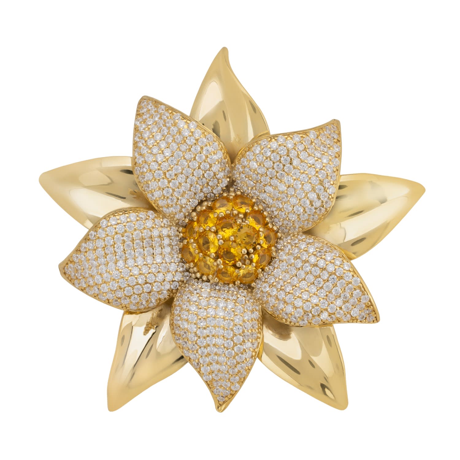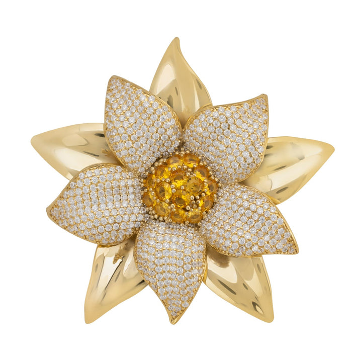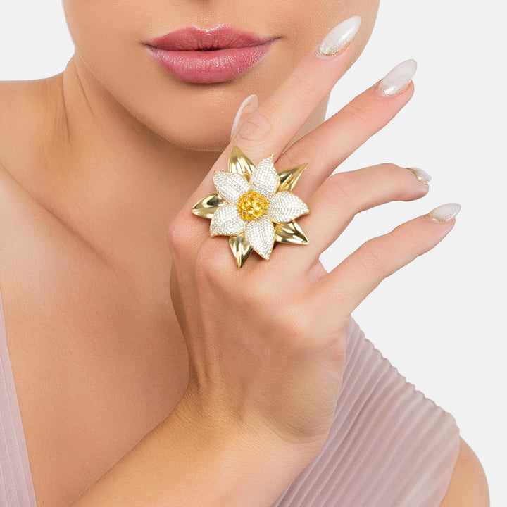 The Marguerite Daisy Flower Cocktail Ring by Latelita is a radiant accessory that brings joy to every gesture. This adjustable ring features ten petals, half sparkling with brilliant white cubic zirconia and half in high-polished gold. A cluster of yellow zirconia stones at the center adds a touch of sunshine. Its bold presence and cheerful design make it perfect for garden parties or any occasion that calls for glamour.