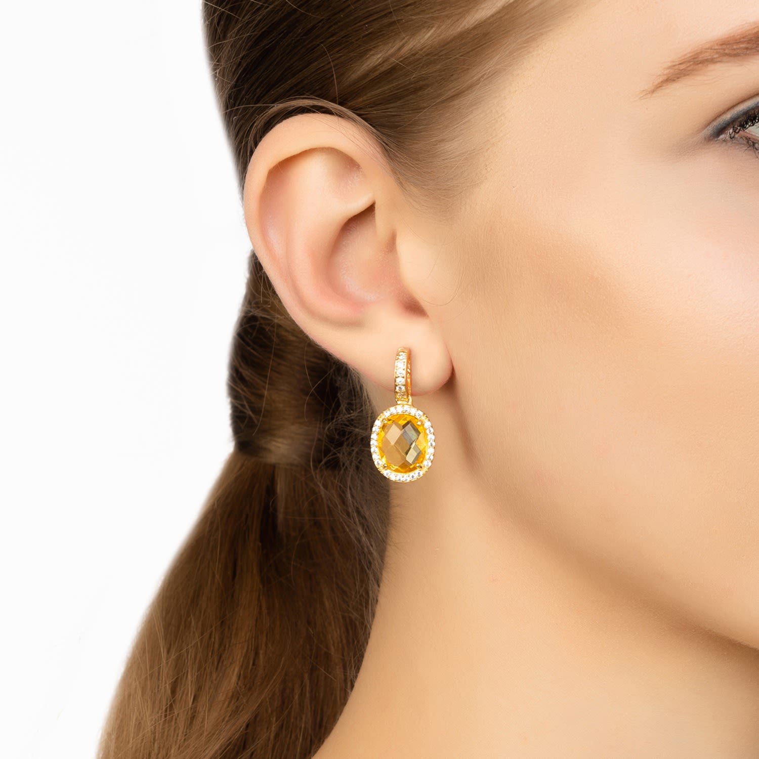 These Beatrice Oval Gemstone Drop Earrings Gold Citrine Hydro by Latelita are regal and radiant, designed to dazzle from day to night. A faceted citrine hydro gemstone glows at the center, surrounded by sparkling white cubic zirconia that amplify its golden brilliance. Citrine, the November birthstone, symbolizes abundance and joy, making this piece both meaningful and luminous. Elegant yet comfortable, they are a versatile choice for weddings, evening occasions, or everyday glamour.