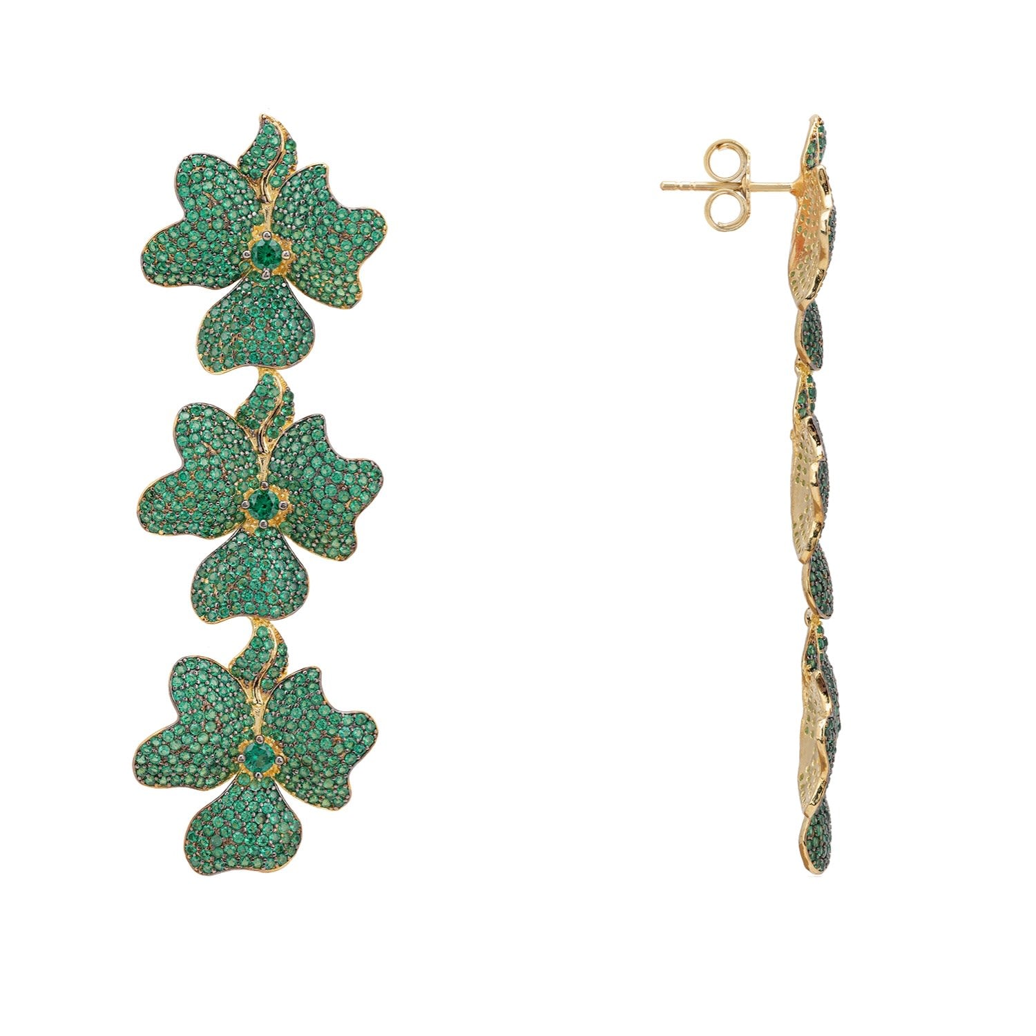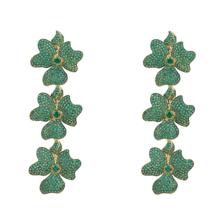 Jasmine Flower Triple Drop Earrings Gold Emerald Green