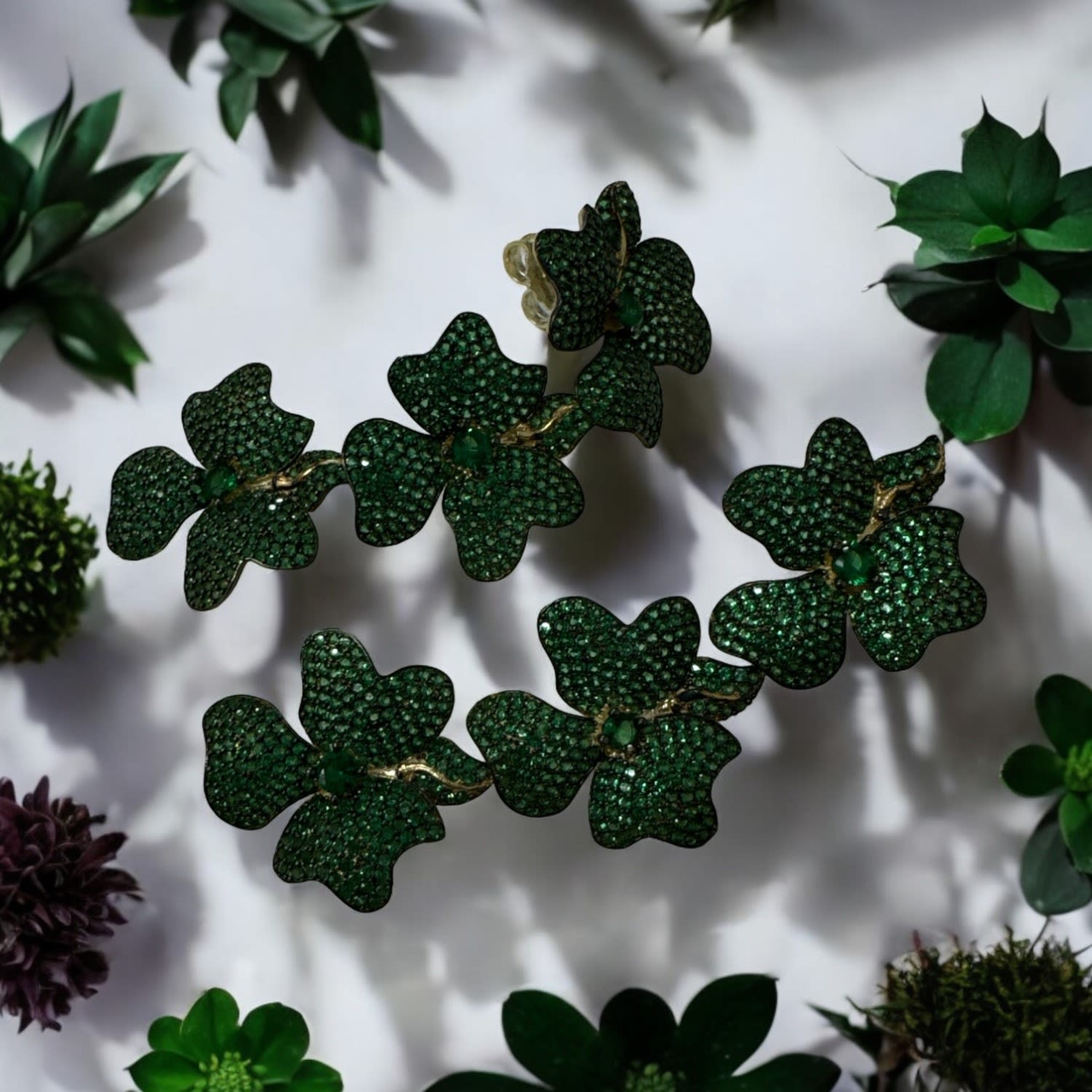 These Jasmine Flower Triple Drop Earrings by Latelita are a dramatic statement piece designed to turn heads. Featuring three linked flowers adorned with sparkling cubic zirconia in a rich emerald green, they add a touch of timeless elegance and sophistication to any outfit. Despite their bold size, they are deceptively light and comfortable, making them perfect for special occasions or black-tie events where you want to shine.