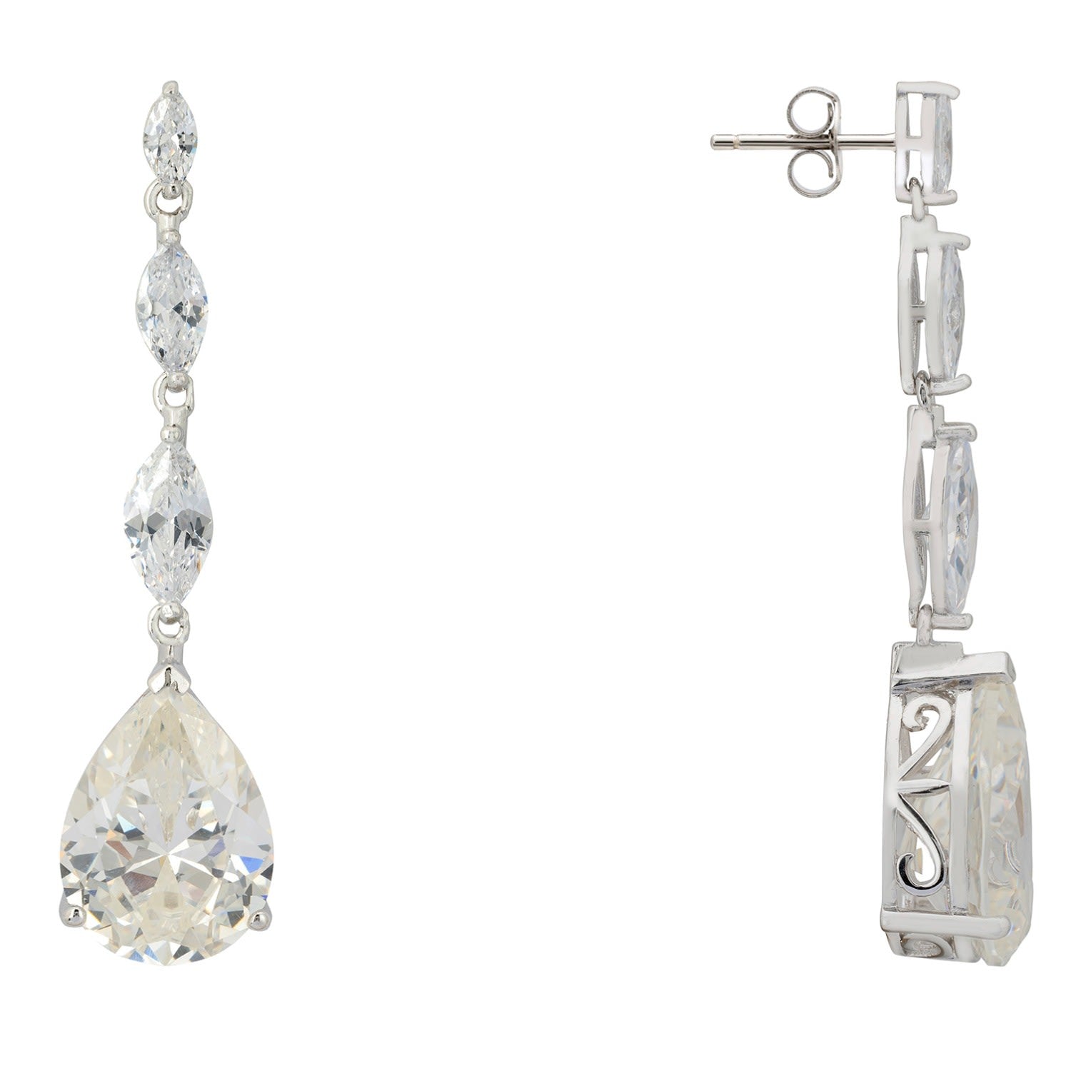 These earrings are handcrafted from 925 Sterling Silver and feature lab-created moissanite and simulated diamonds.