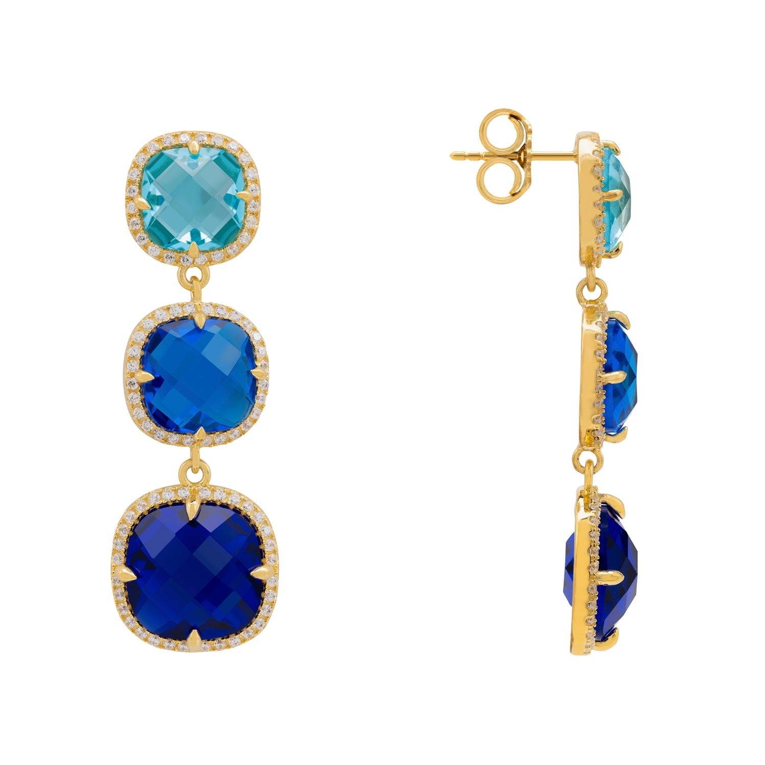 Handcrafted from 925 sterling silver dipped in 18ct gold, these earrings feature blue topaz, London blue topaz, sapphire, and cubic zirconia.