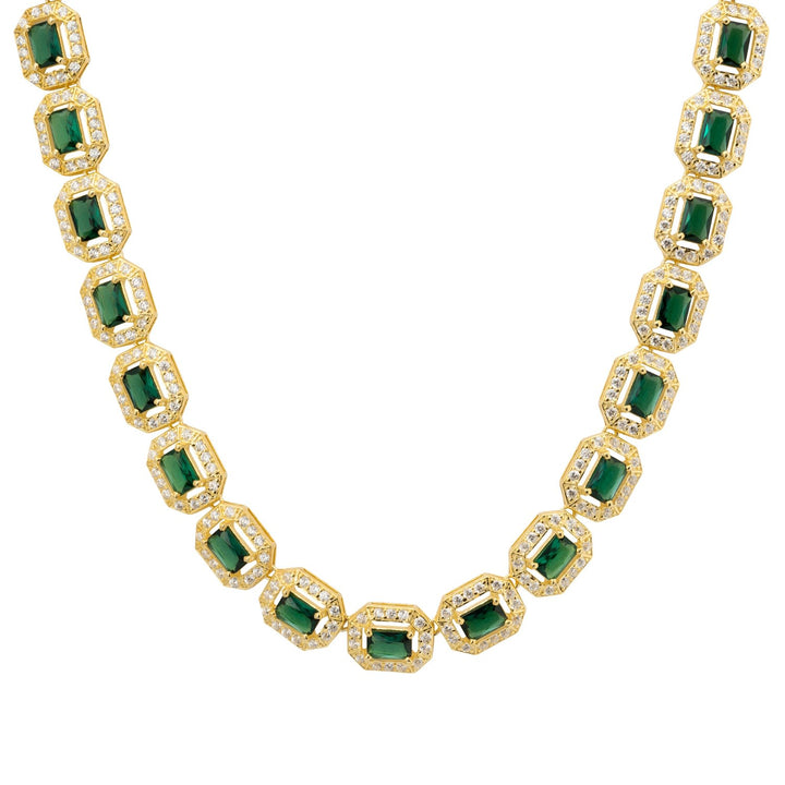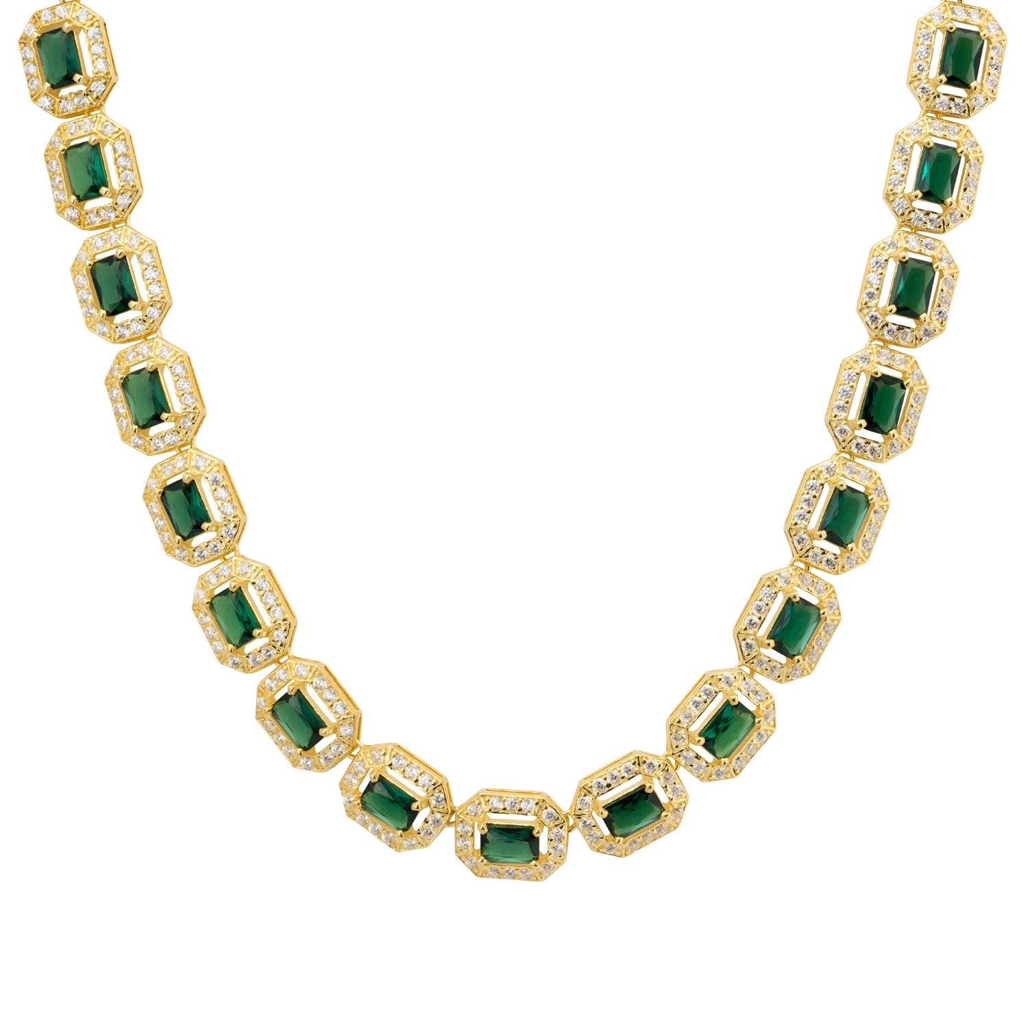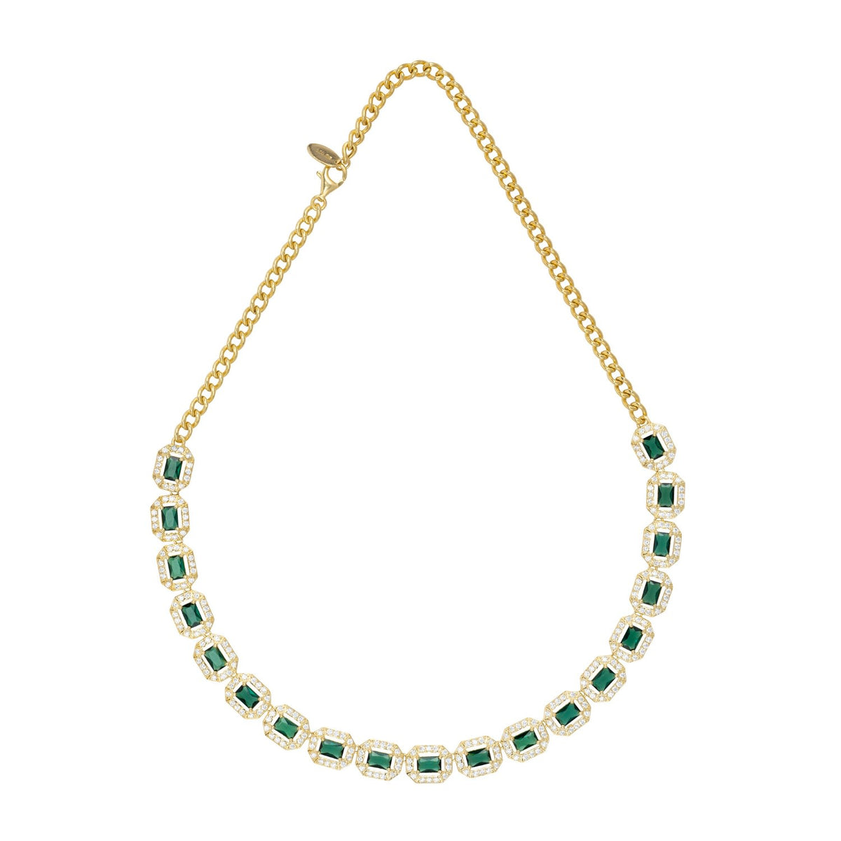 This necklace is handcrafted from 925 Sterling Silver dipped in 22ct Gold and is set with lab-grown emeralds and cubic zirconia.