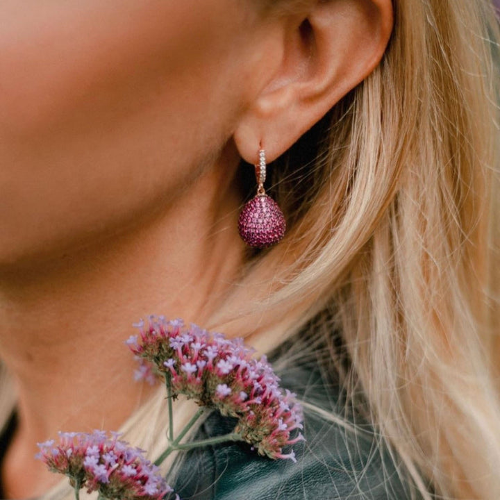 These earrings are made from 925 sterling silver dipped in 18ct rose gold and are set with Ruby AAA Cubic Zirconia. They have a creole fastening.