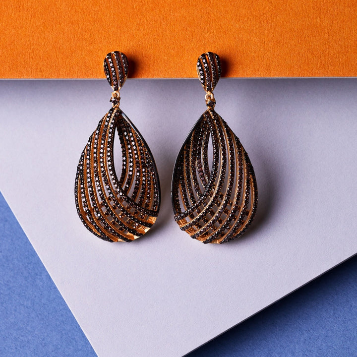 These Vortex Teardrop Earrings Chocolate Cz by Latelita are a striking and elegant statement piece. Handcrafted from sterling silver and dipped in 22ct gold, they feature a three-dimensional open lattice teardrop design adorned with micro pave chocolate cubic zirconia. These earrings are perfect for special occasions and black-tie events, adding a touch of mesmerizing sparkle and sophisticated charm to your look.