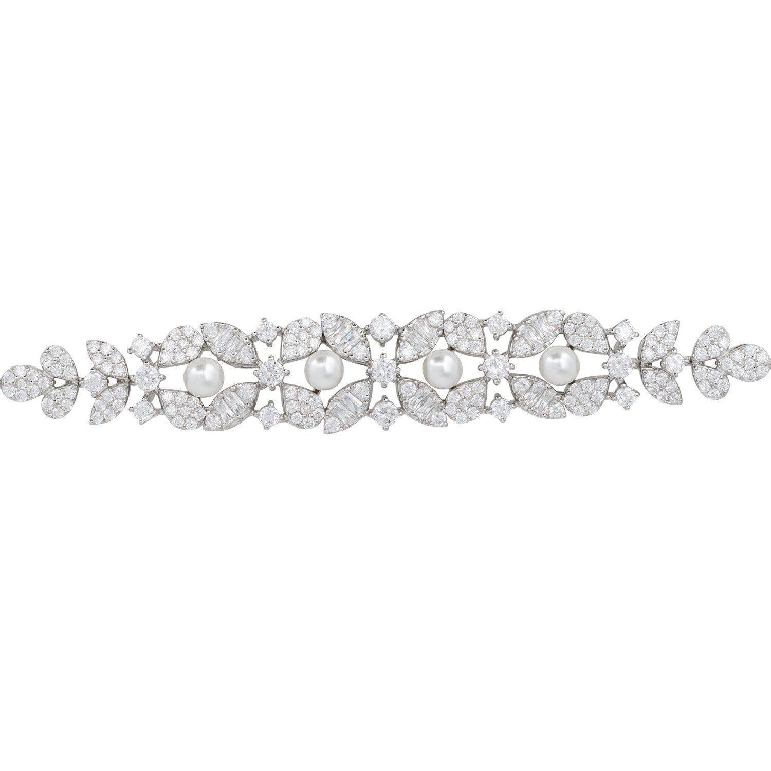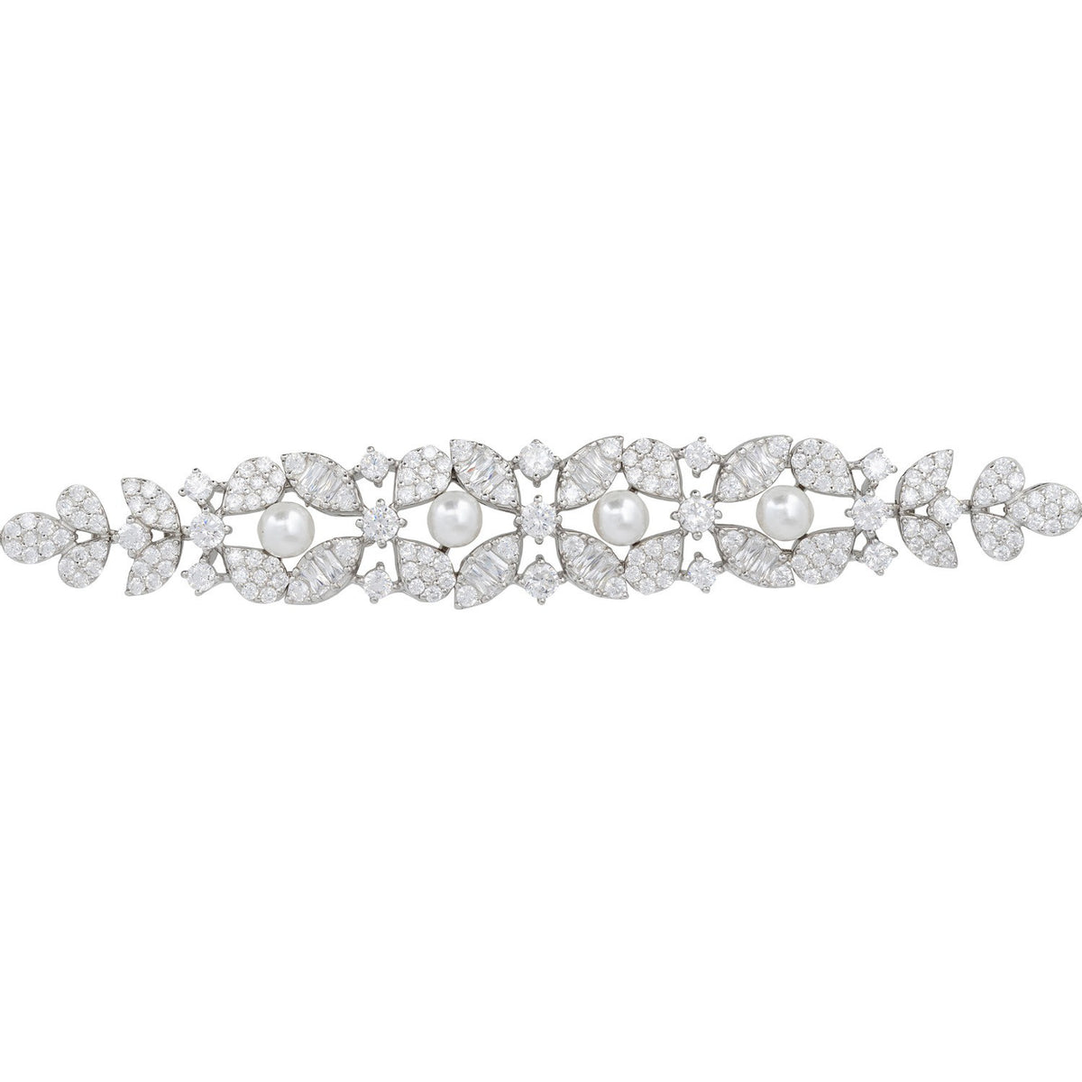 Handcrafted from 925 sterling silver dipped in rhodium. It features Majorica pearls and simulated diamonds.