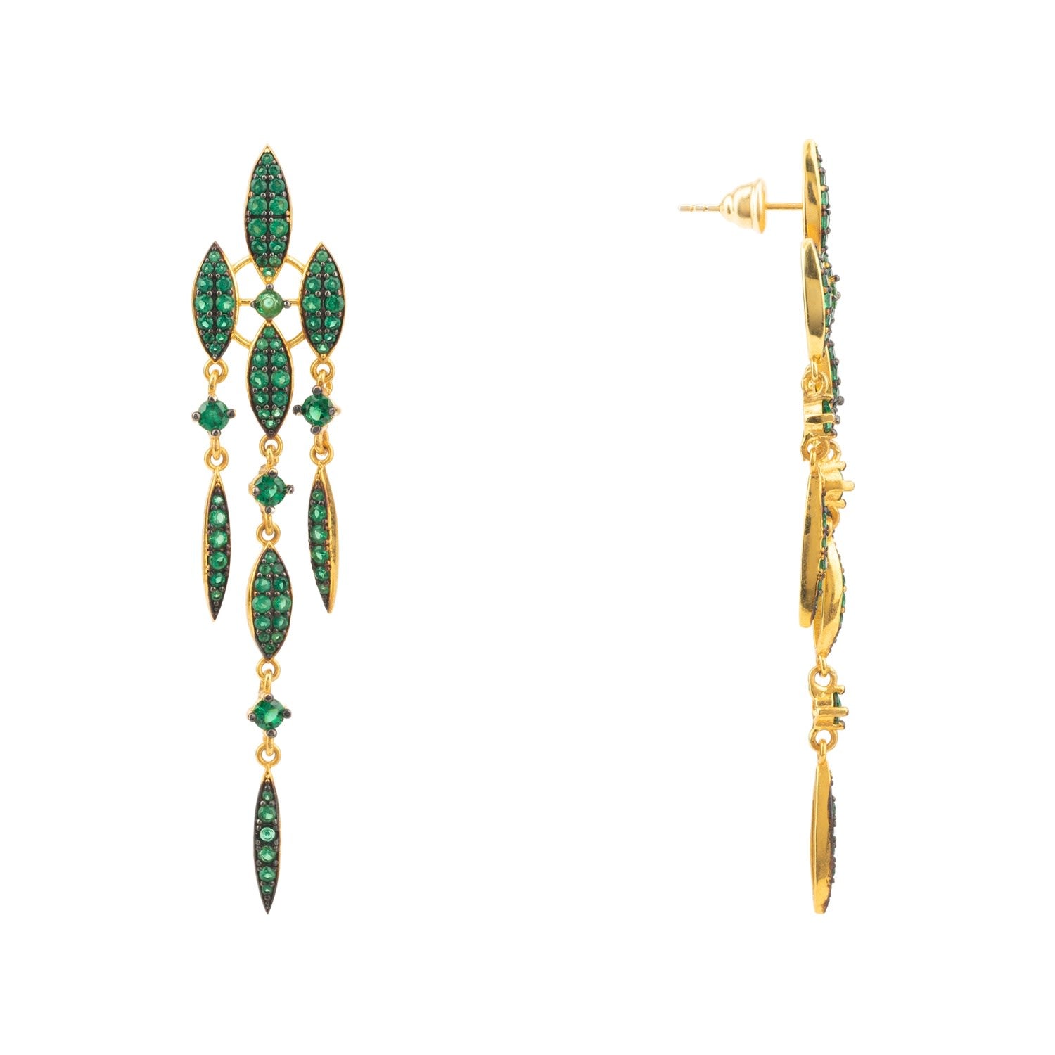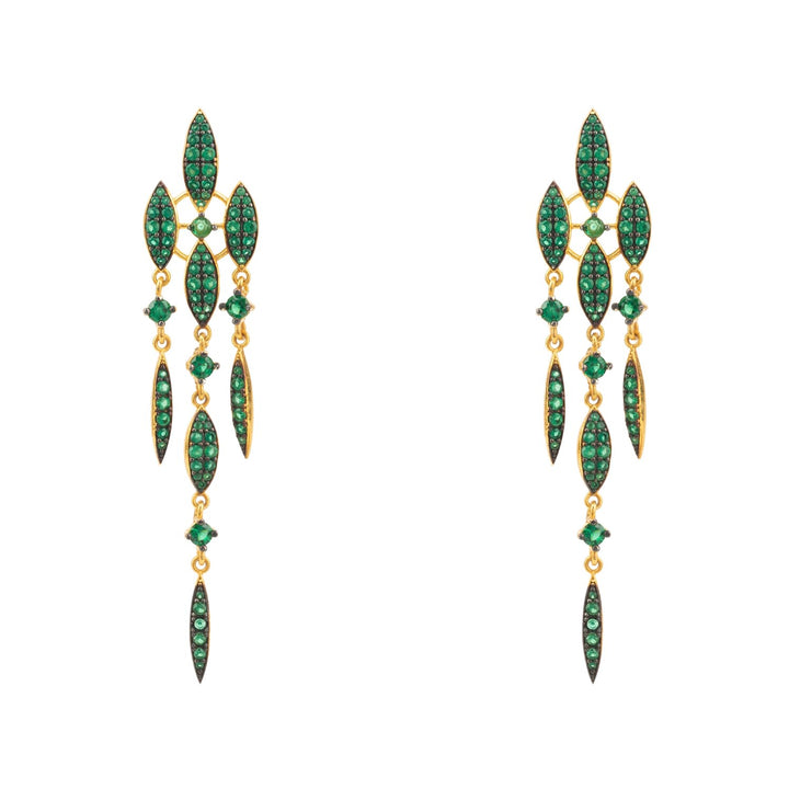 The Valencia Statement Drop Earring Emerald Green Cz Gold by Latelita dazzles with an abundance of emerald-green zircons. This lightweight and comfortable earring features a triple-strand drop design, with eight marquis-shaped settings and a single square-cut zircon. Perfect for adding a touch of sparkle to any bridal, evening, or cocktail party outfit, these earrings are a statement piece that will be cherished for years to come.