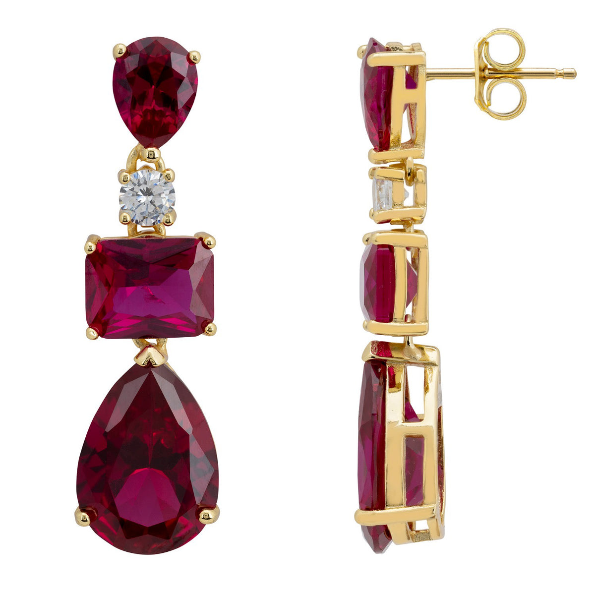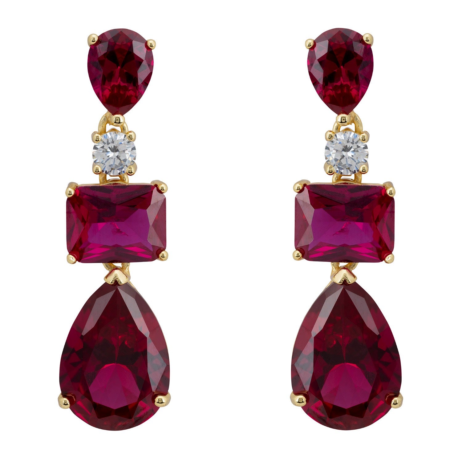 The Valentina Drop Earrings Gold Ruby by Latelita add a glorious splash of color and sparkle to any look. These classic and versatile earrings feature a beautiful combination of a pear-shaped lab-created ruby, a rectangular-cut ruby, and a round-cut simulated diamond. The ruby symbolizes passion, power, and love, making these earrings a meaningful and exquisite choice.