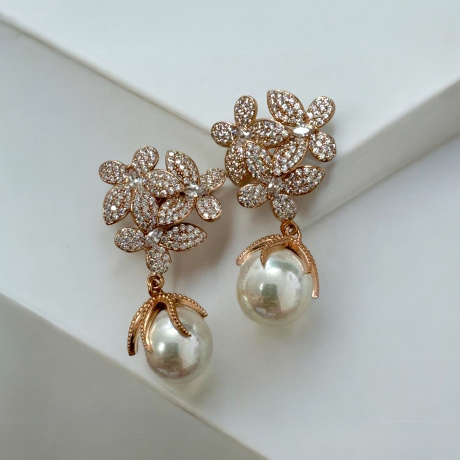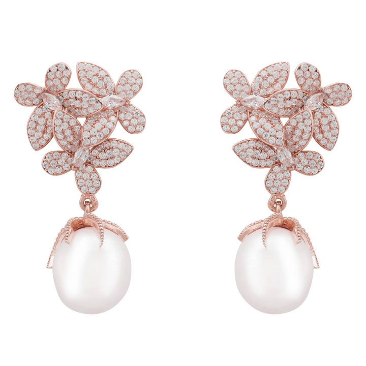 Handcrafted from 925 sterling silver dipped in 18ct rose gold, these earrings are set with pearls and cubic zirconia.