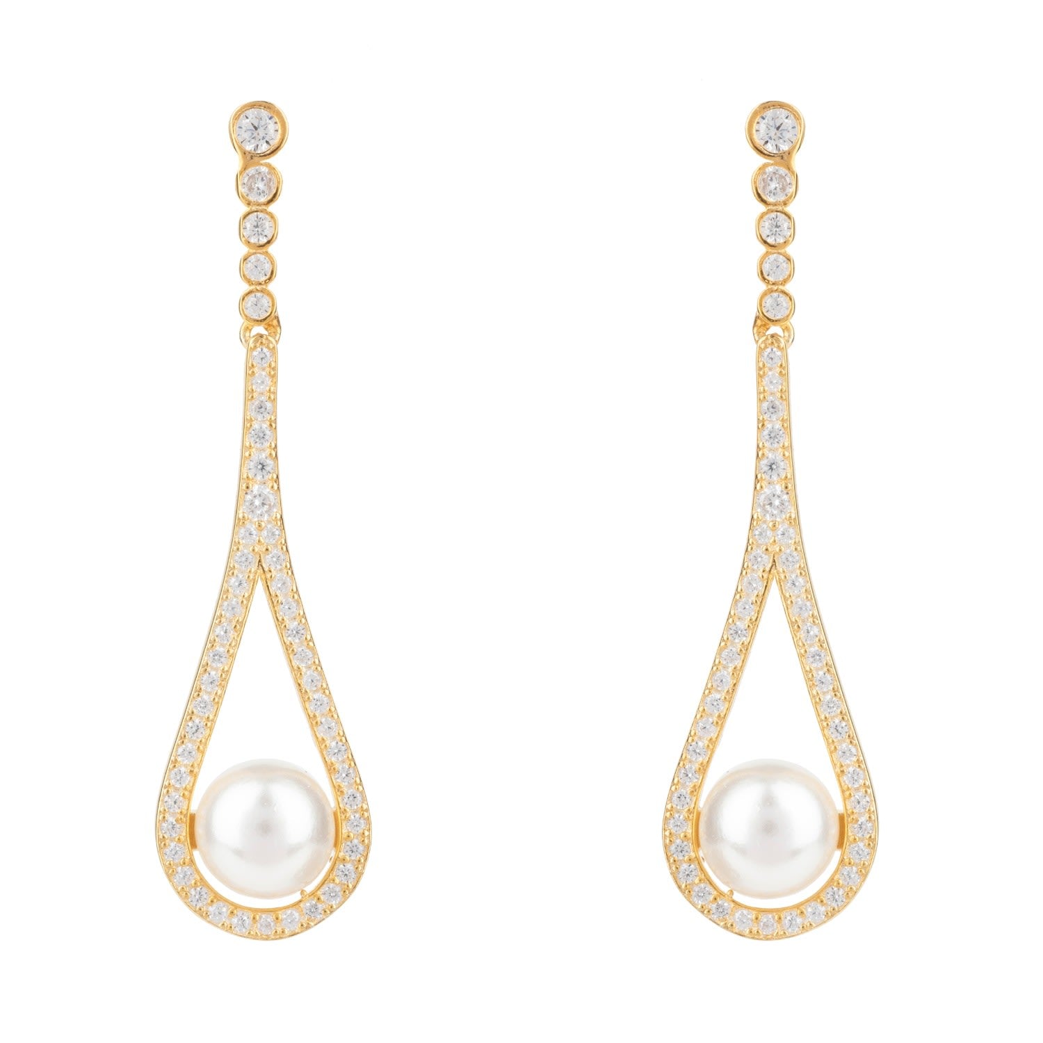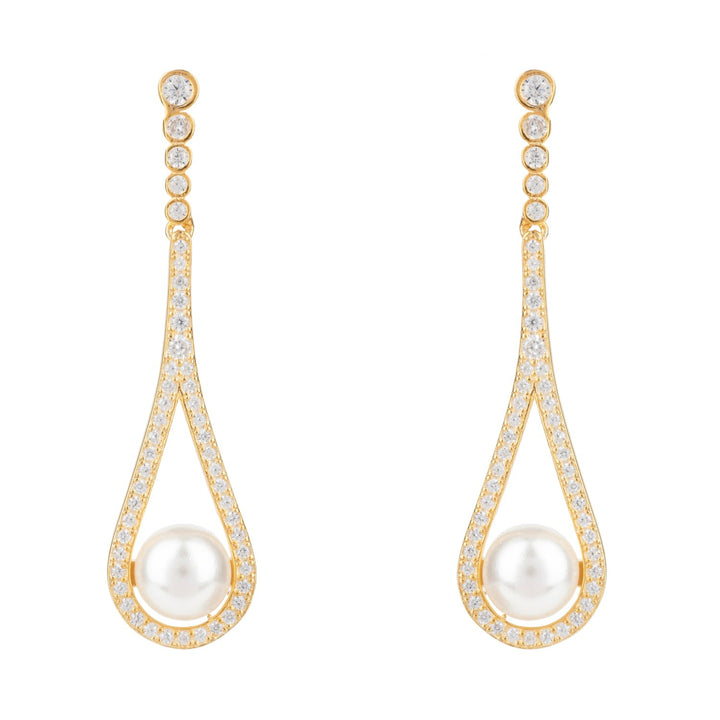 These drop earrings are handcrafted from 925 sterling silver with 18ct gold plating. They are set with AAA cubic zirconia and a freshwater pearl. They are pierced earrings with a post back and butterfly fastening.